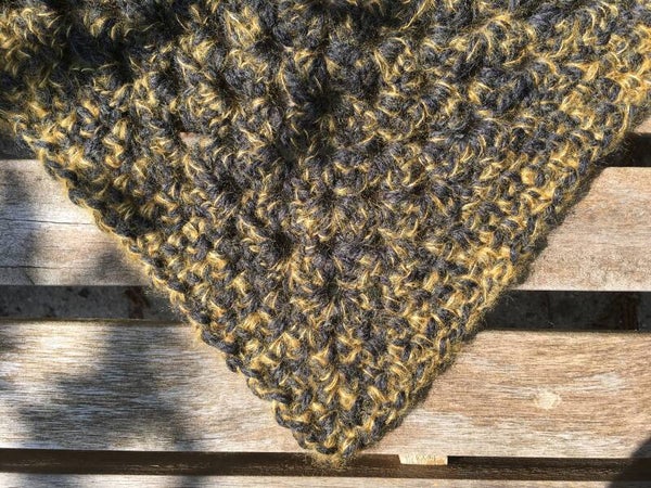 Triangular, medium sized wrap/shawl, extremely soft. The Hugs are our nice, warm shawl of "normal" size. We call them Hugs because they feel like a hug - soft and friendly to wear. Having used two threads, it is a charcoal grey with an ochre yellow. You can use it as a wrap, but also as a scarf around your neck, with the point in front. It's really easy to shape and has extra long ‘wings’ so the knot will stay in place.