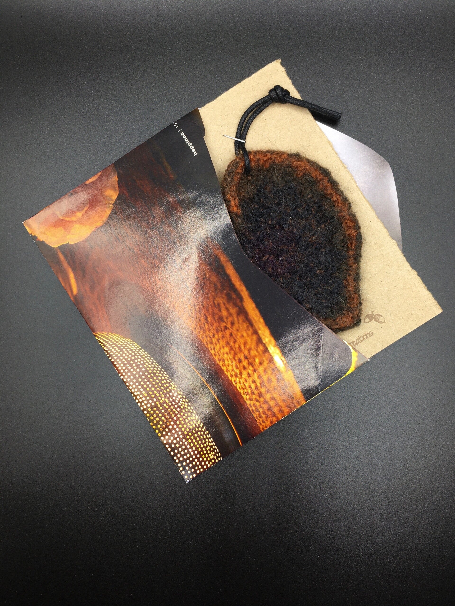 - Materials: Tag - handmade from 100% wool, felted. Card - made of recycled cardboard. Envelope - made of up-cycled magazines.