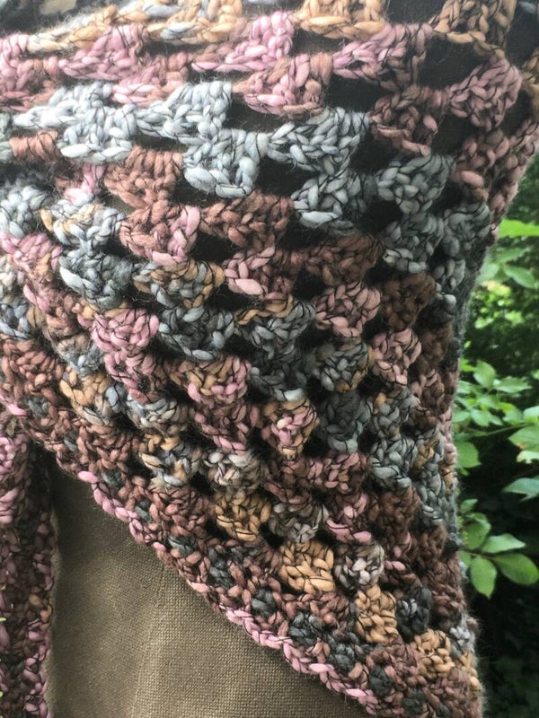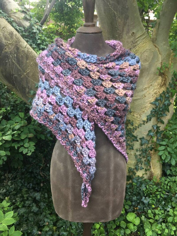 Deze knuffel-sjaal is heel licht en ook heel makkelijk. Je kunt hem als omslagdoek gebruiken, of als sjaal om de hals met de punt naar voren. Hij vormt makkelijk, en heeft extra lange 'vleugels' zodat de knoop blijft zitten.