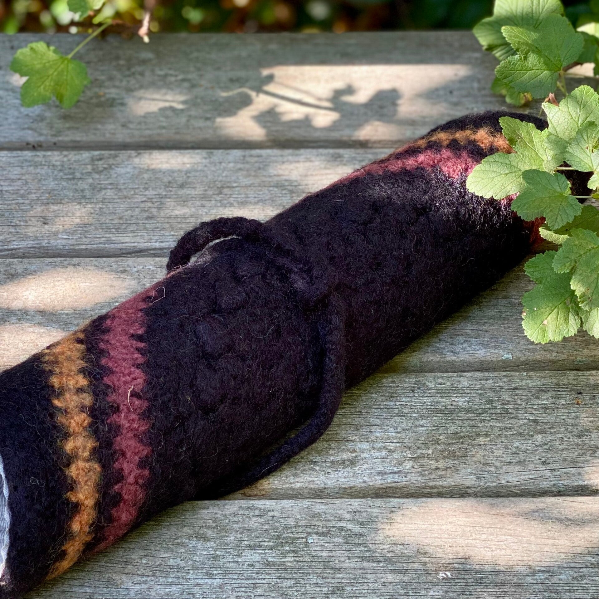 A pretty, but also very practical mat, suitable for just about all outdoor situations: the woolen mat is crocheted and felted afterwards, making it very insulating against cold from the below. It is easy to roll up and to bind it with the straps, making it fit in the side-pocket of a backpack. It is excellent for festivals, hiking, or simply for the bench in your back garden - your outdoor season just gets prolonged.