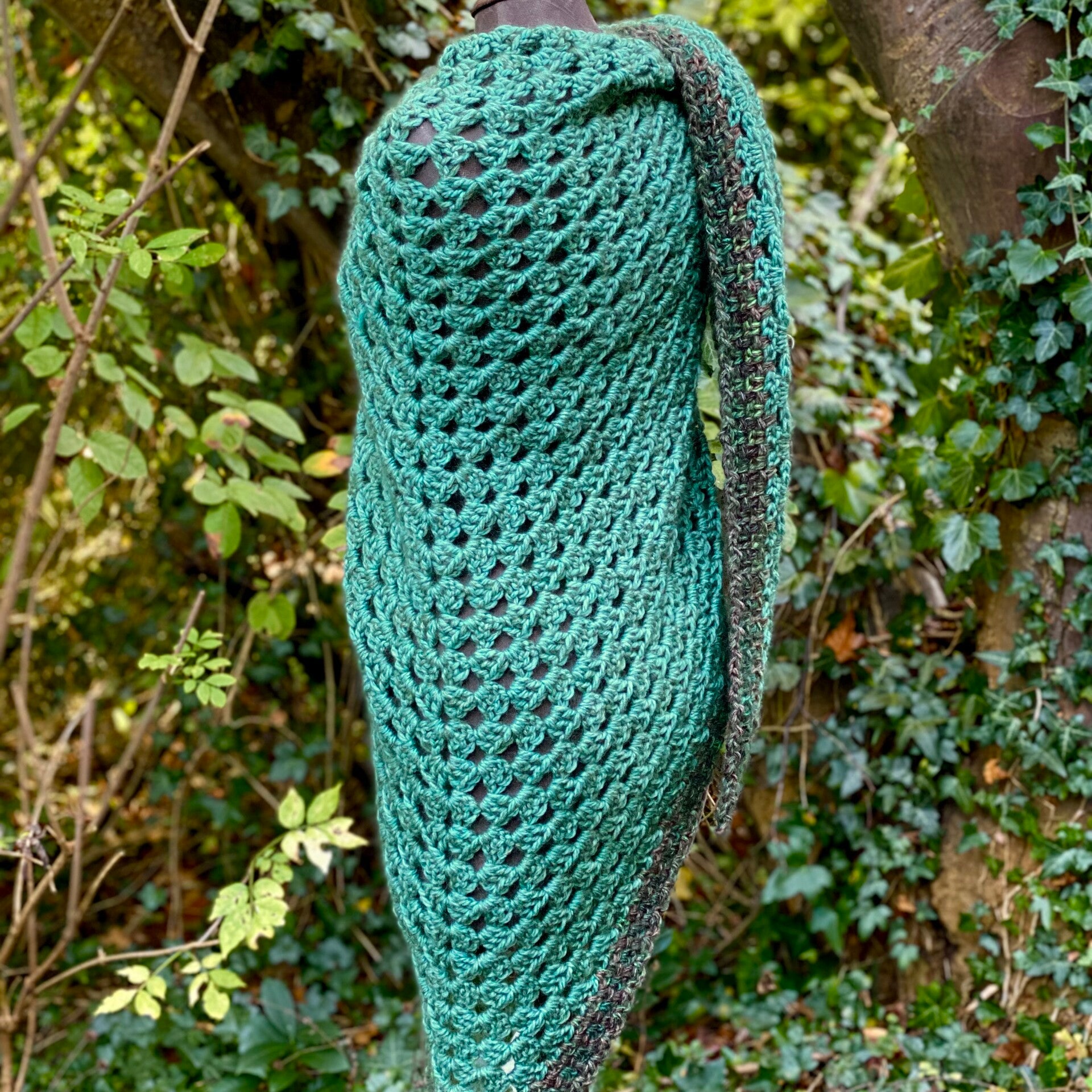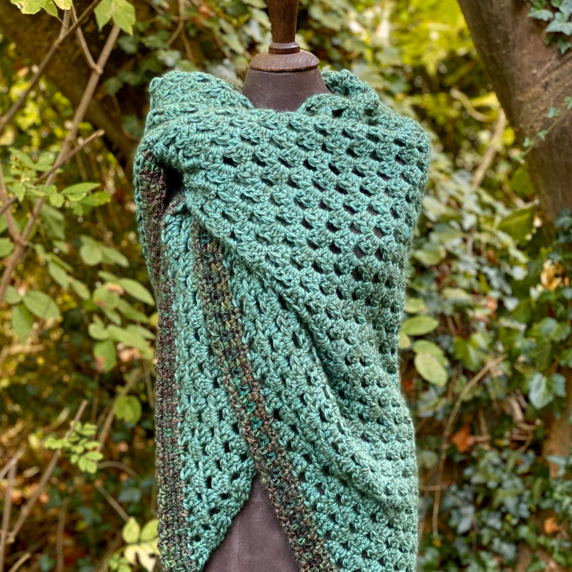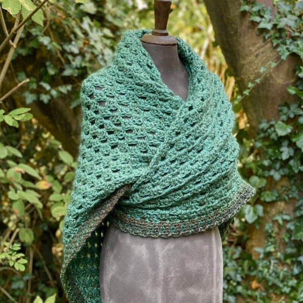 It can be used as a wrap, or as a huge shawl with the point in front. It's really easy to shape, and has extra long "wings" to secure that it stays in place too.