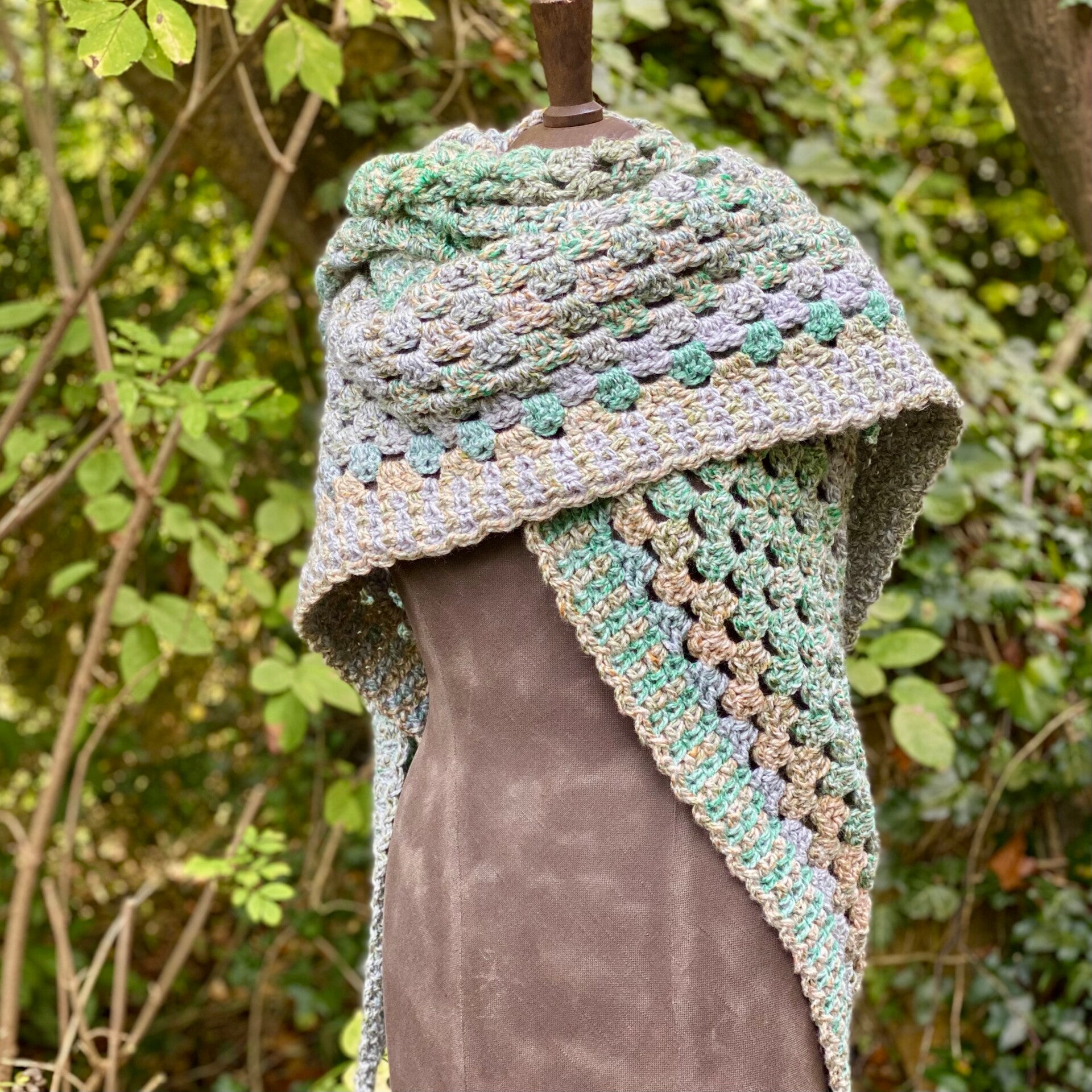 It can be used as a wrap, or as a huge shawl with the point in front. It's really easy to shape, and has extra long "wings" to secure that it stays in place too.