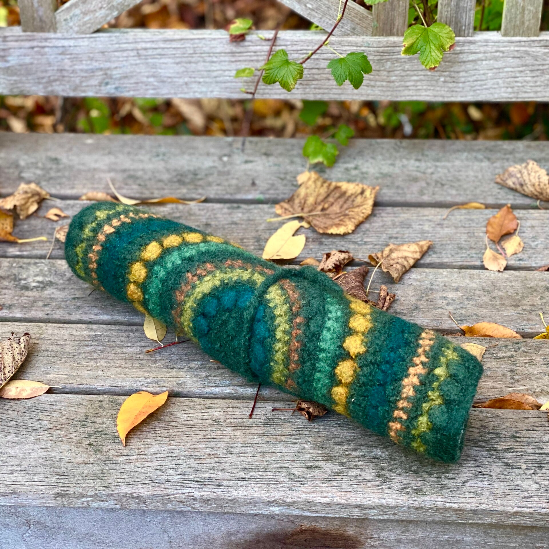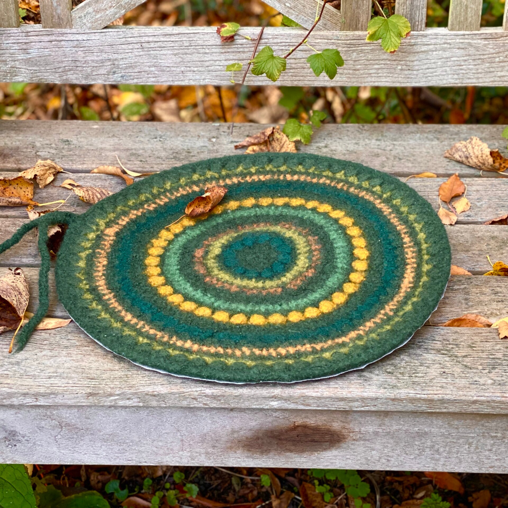 A pretty, but also very practical mat, suitable for just about all outdoor situations: the woolen mat is crocheted and felted afterwards, making it very insulating against cold from the below. It is easy to roll up and to bind it with the straps, making it fit in the side-pocket of a backpack. It is excellent for festivals, hiking, or simply for the bench in your back garden - your outdoor season just gets prolonged.