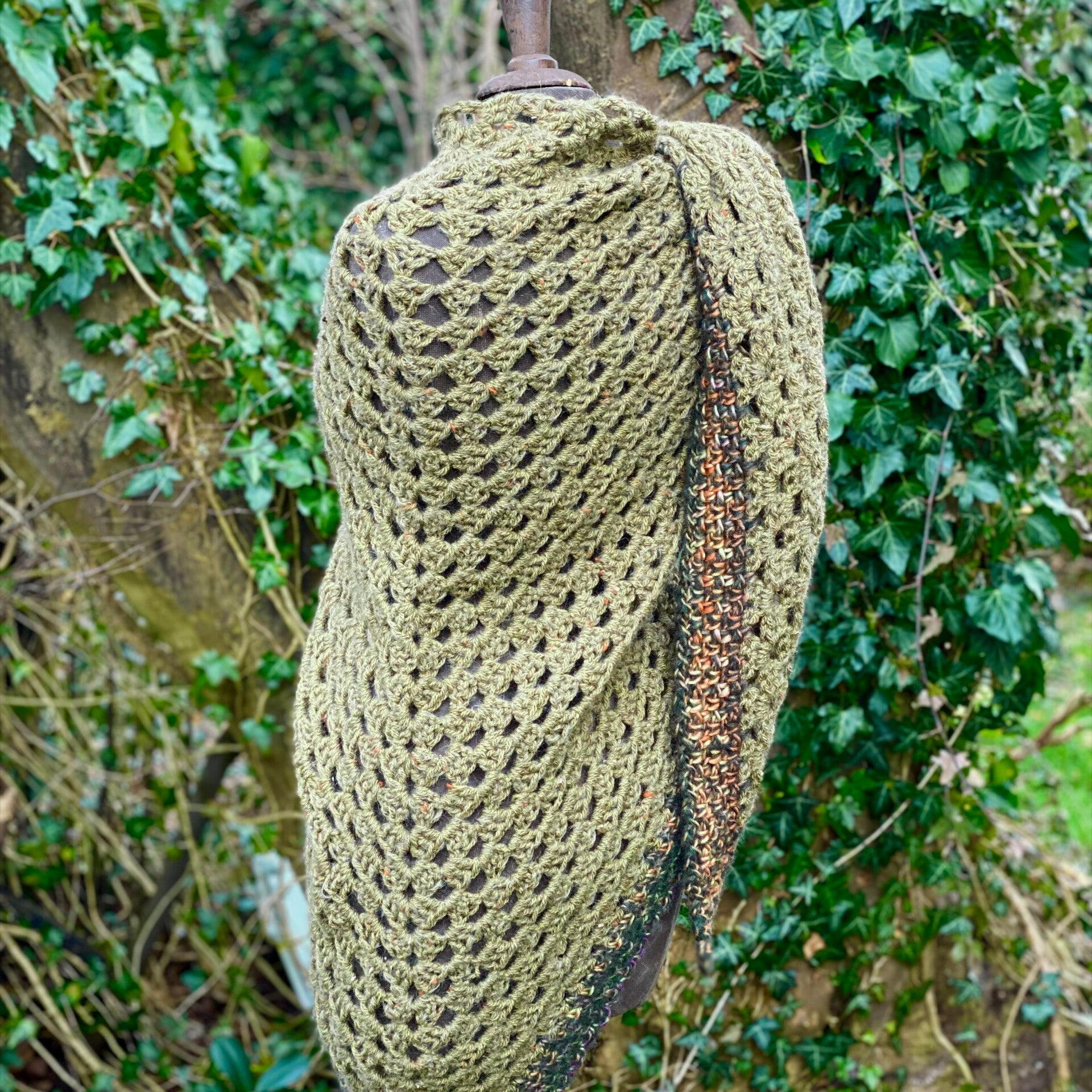 It can be used as a wrap, or as a huge shawl with the point in front. It's really easy to shape, and has extra long "wings" to secure that it stays in place too.