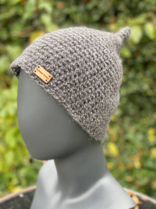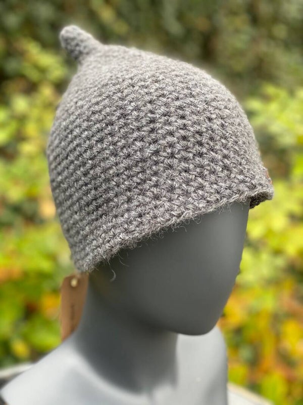 A cute and funny little beanie in a typical 'pixie shape': A little bit bell shaped. Made from 100% wool slightly felted (fulled) after crocheting to make it really warm.