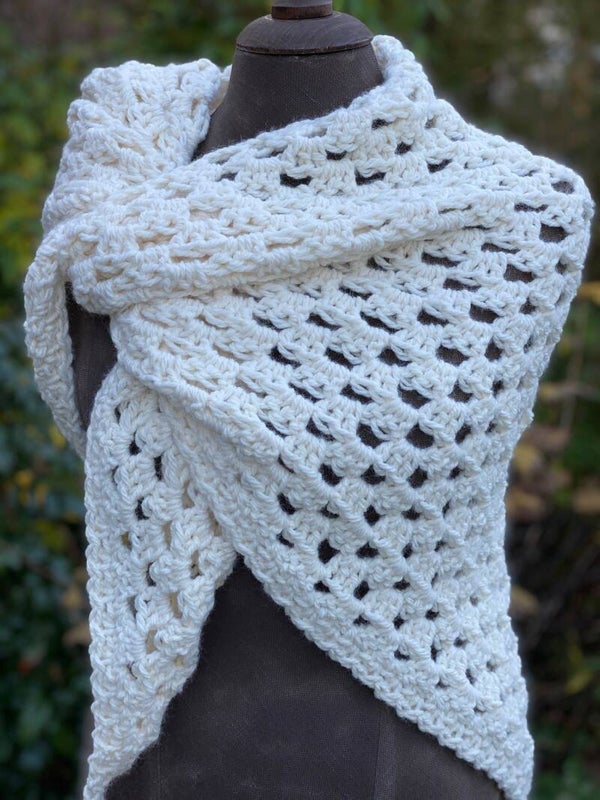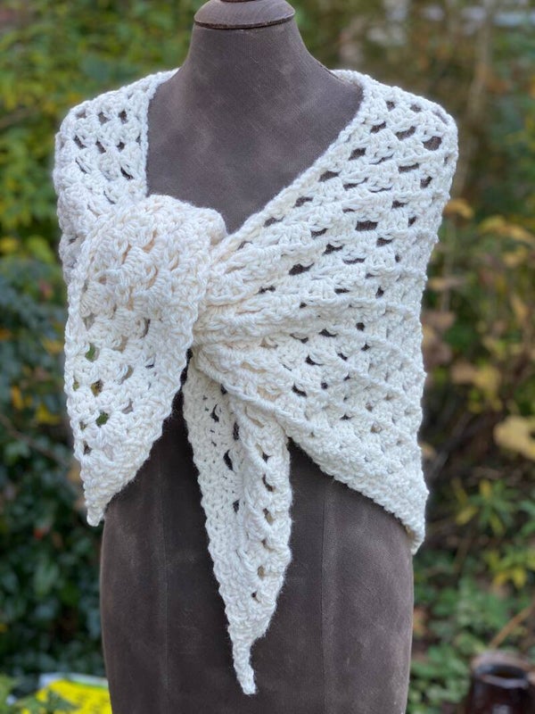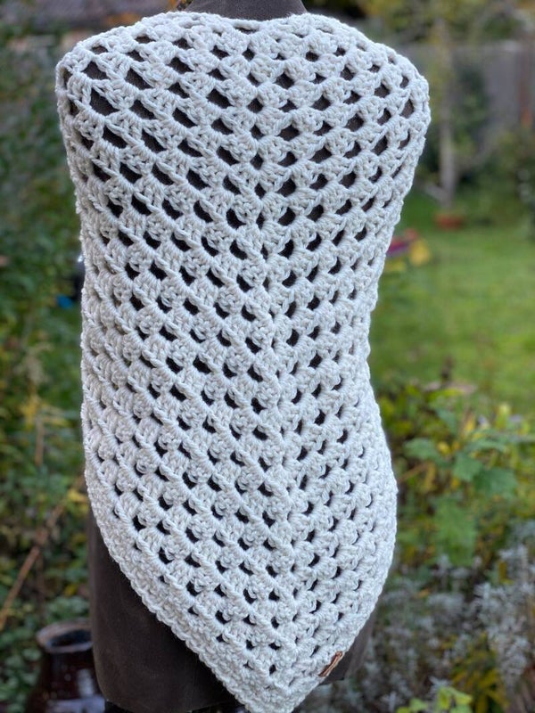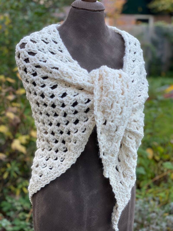 Triangular, medium sized wrap/shawl, made from extra chunky, no-wool yarn. The Hugs are our nice, warm shawls of "normal" size. We call them Hugs because they feel like a hug - soft and friendly to wear. You can use it as a wrap, but also as a scarf around your neck, with the point in front. It's really easy to shape and has extra long ‘wings’ so the knot will stay in place.