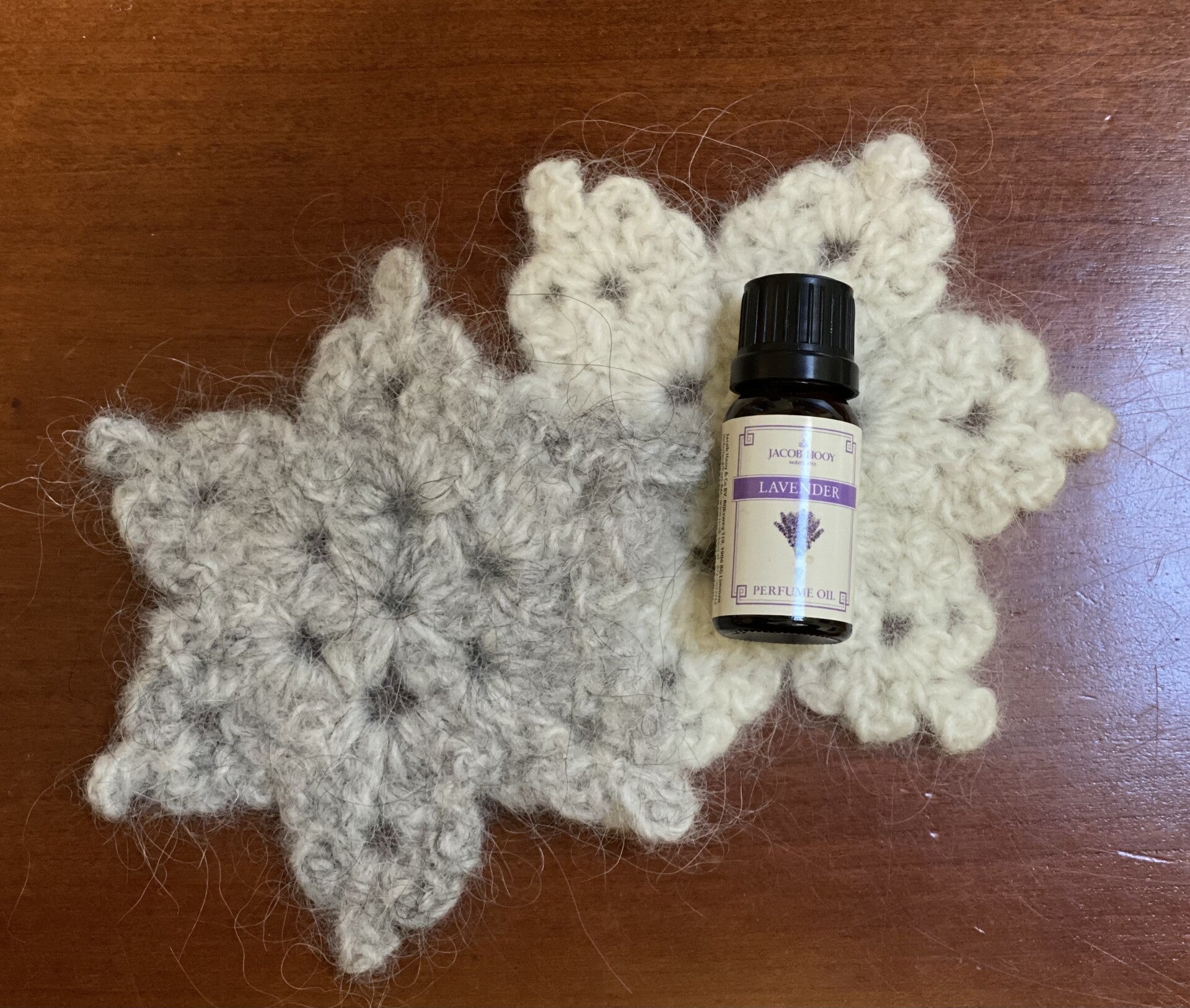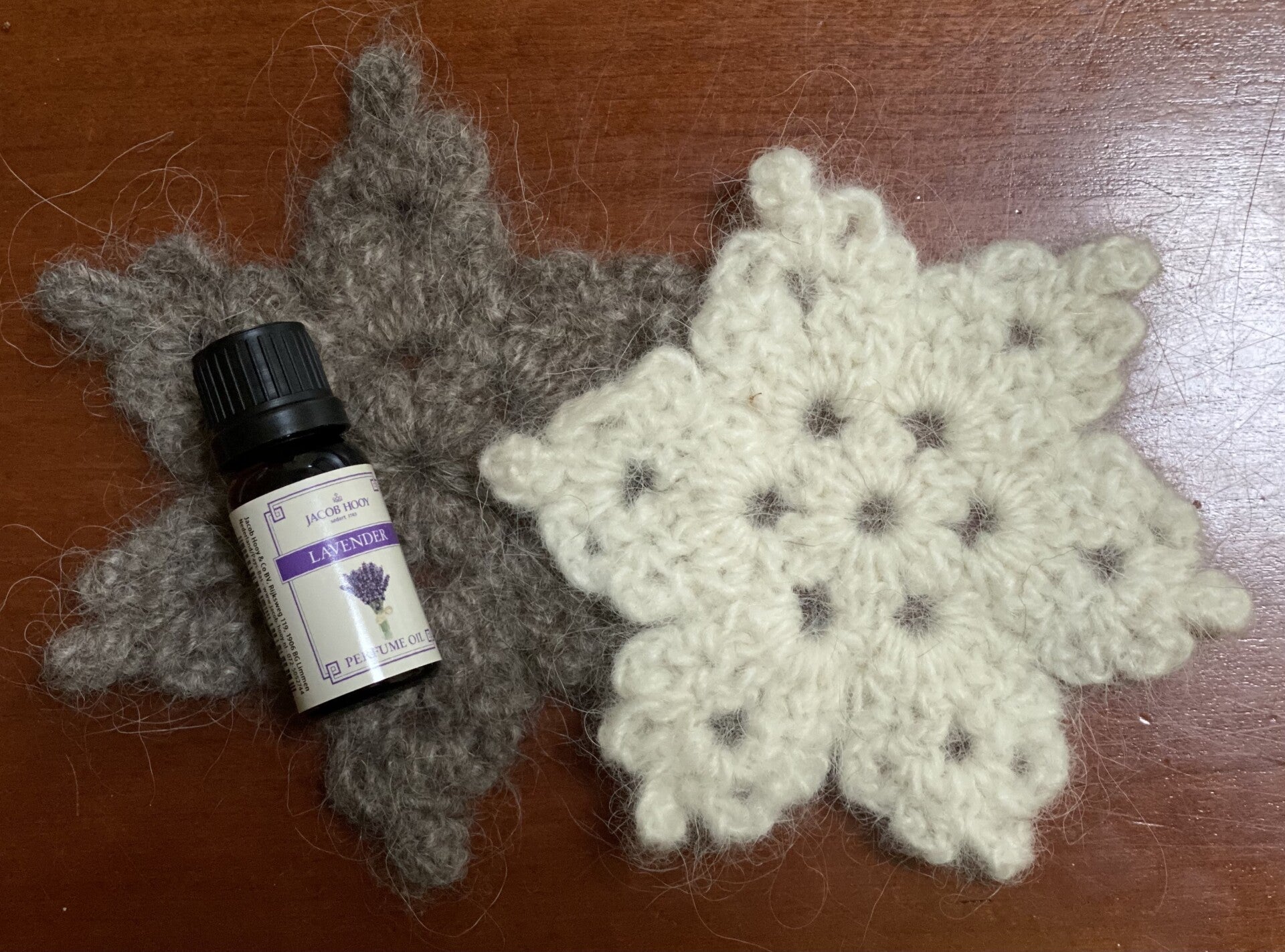 The snowflake tags have been crocheted from wool, then felted by hand and dried. They are cute for hanging just about anywhere: on a twig, on the actual Christmas tree, in the car. If you put a couple of drops of the aromatic oil on them, the wool will hold the fragrance and release it ever so slowly, especially if they sway in a breeze.