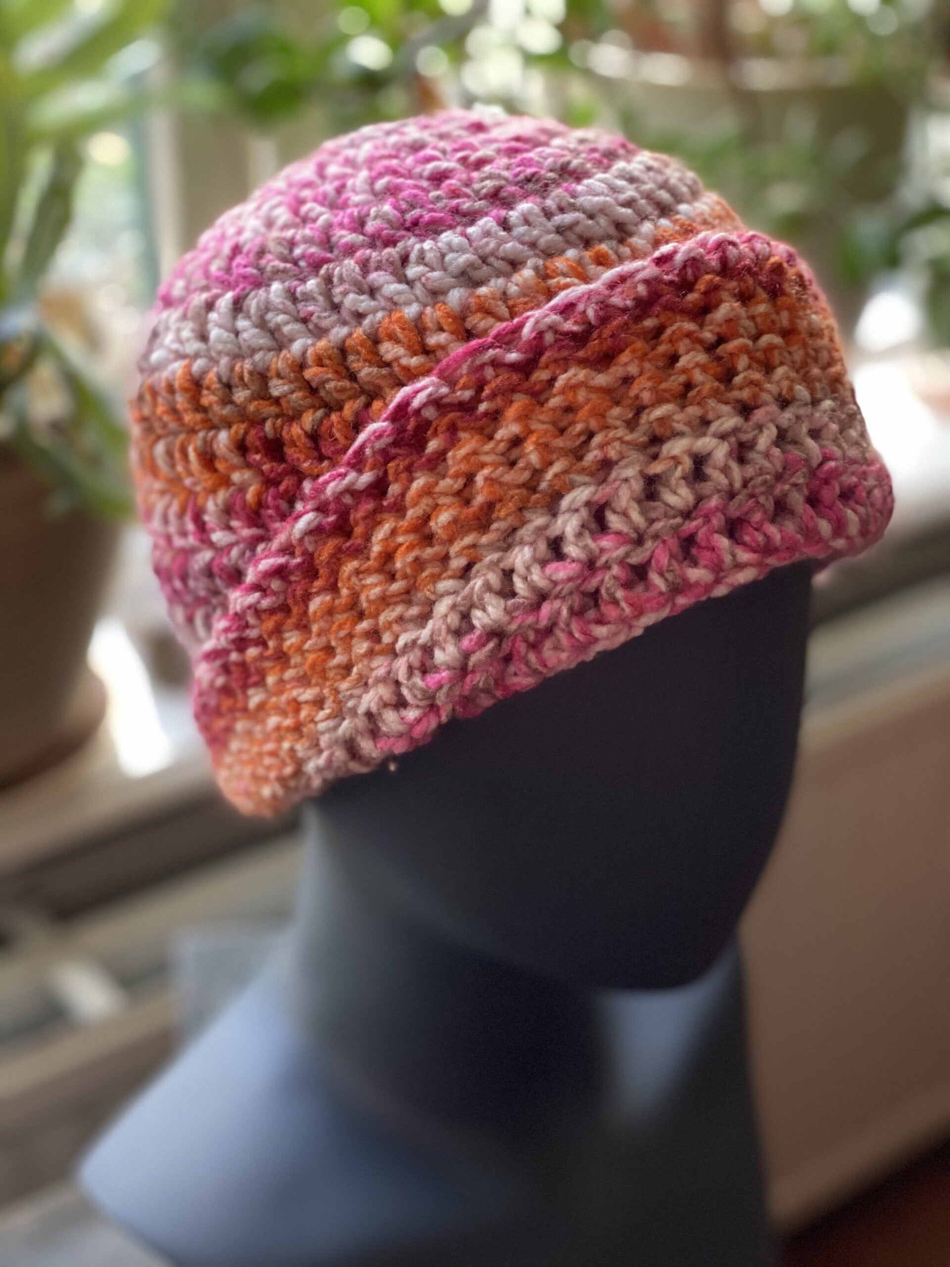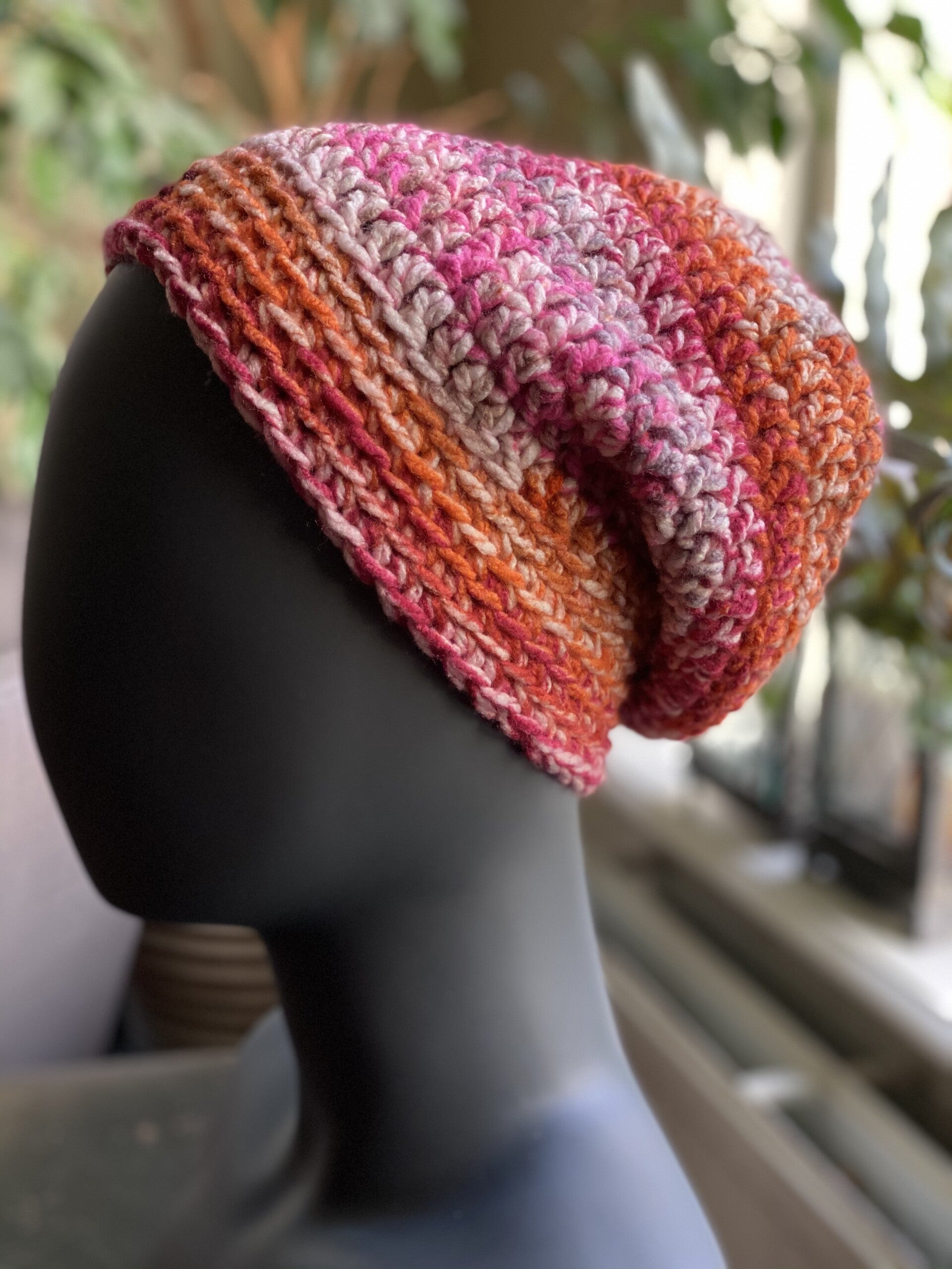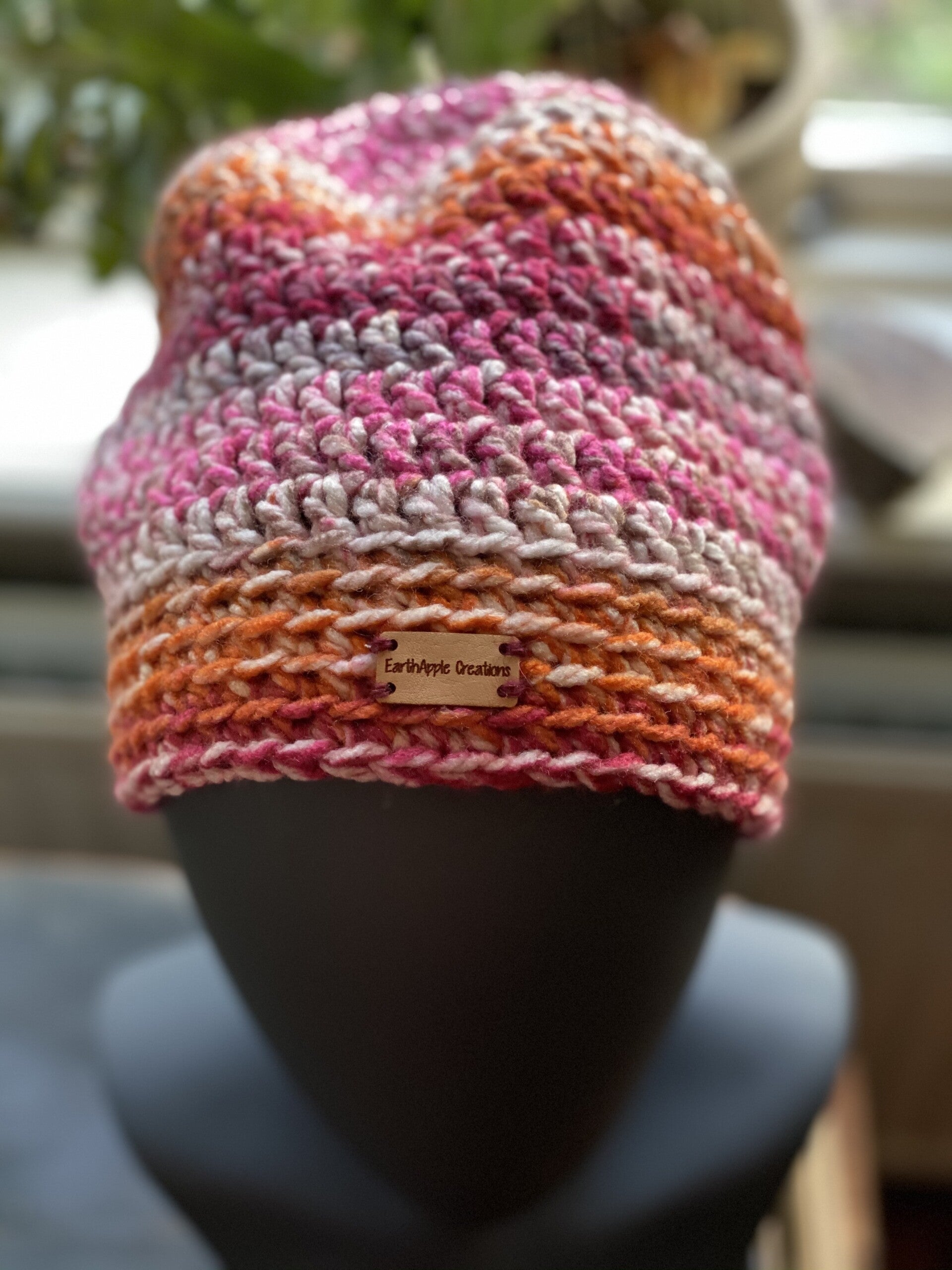 An awesome beanie made in a very comfortable yarn, a thick acrylic. Nice to wear. Easy to wash.