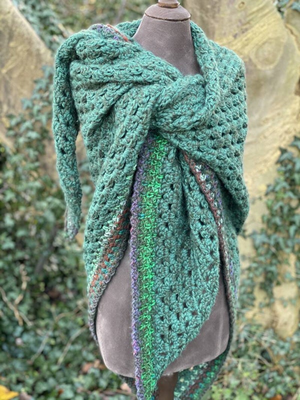 Driehoekige, supergrote omslagdoek, extreem zacht door de combinatie van drie verschillende draden. Hij is bosgroen met een gekleurde rand. Ondanks de grootte van de doek voelt hij in het geheel niet zwaar aan, maar gewoon warm en prettig - echt een knuffel.