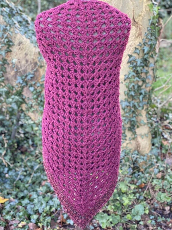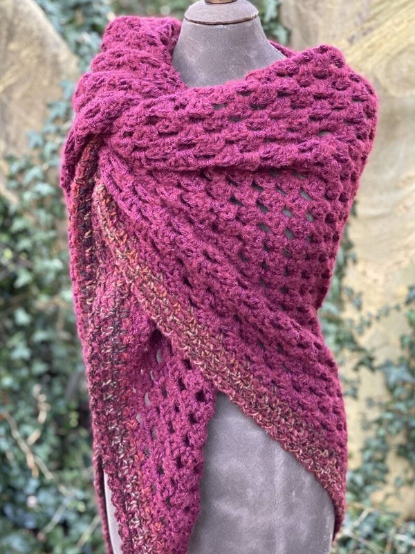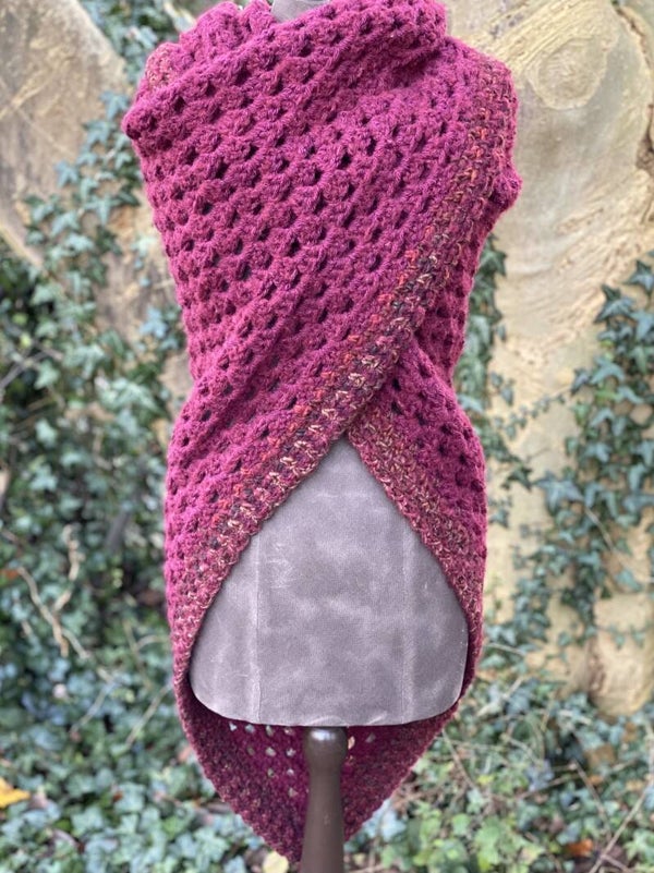 Deze supergrote omslagdoek is extreem zacht en lekker warm. Hij is mooi aubergine met een rand in bruine en wijnrode nuances. Ondanks de grootte van de doek voelt hij in het geheel niet zwaar aan, maar licht en prettig. Hij is gehaakt van drie verschillende garens, dat geeft de kleureneffecten en het fijne gevoel - als een knuffel dus.