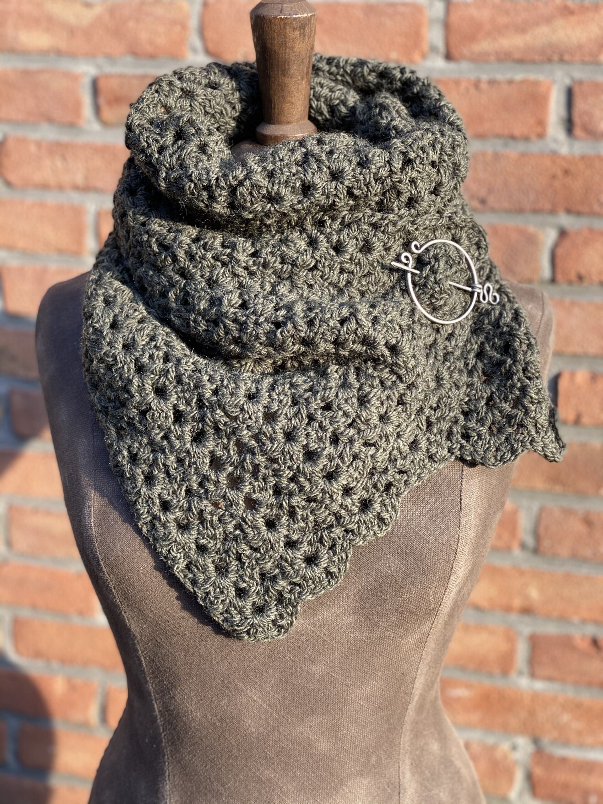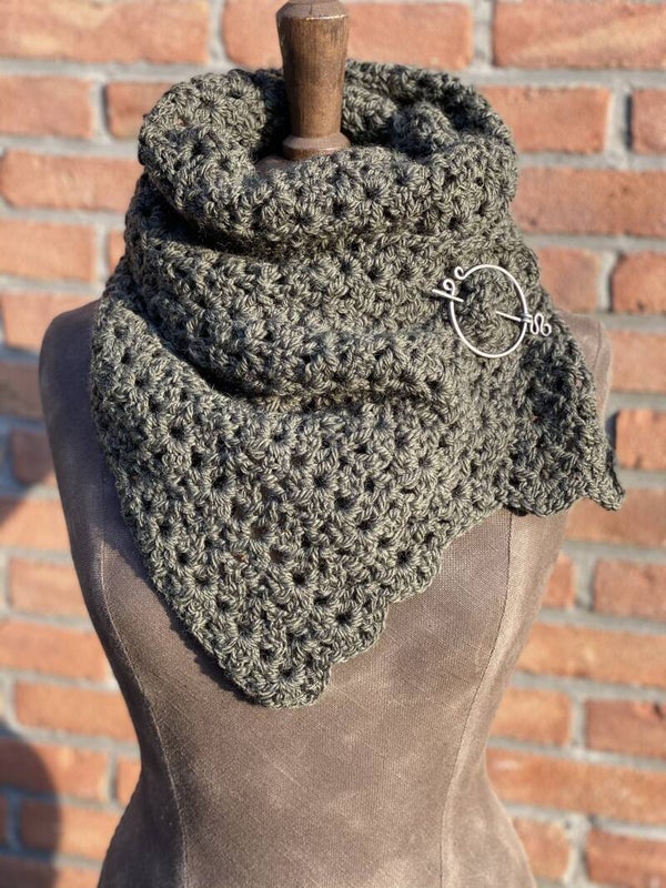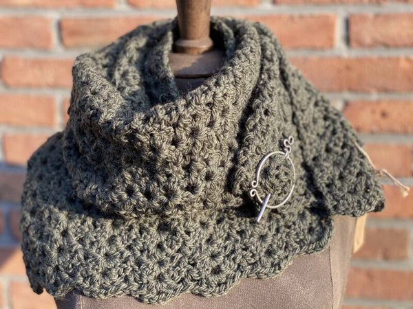 Sierlijke, olijf groene sjaal van 100% wol. Wordt zoals alle wol steeds zachter in gebruik. Gemaakt om even over je schouders te gooien of juist om je hals onder (of boven) je jas te dragen. Wordt geleverd met een pin, een fibula.