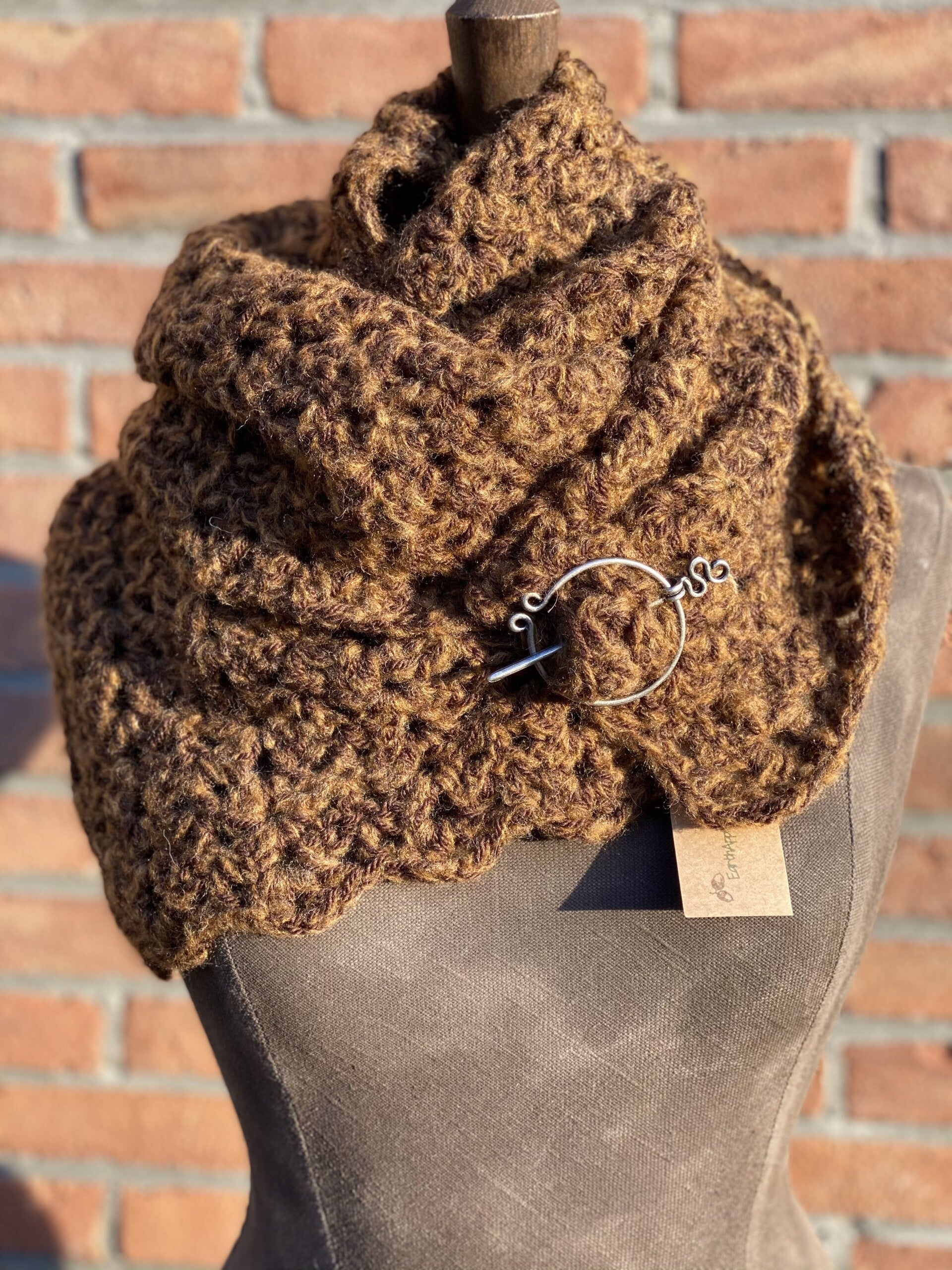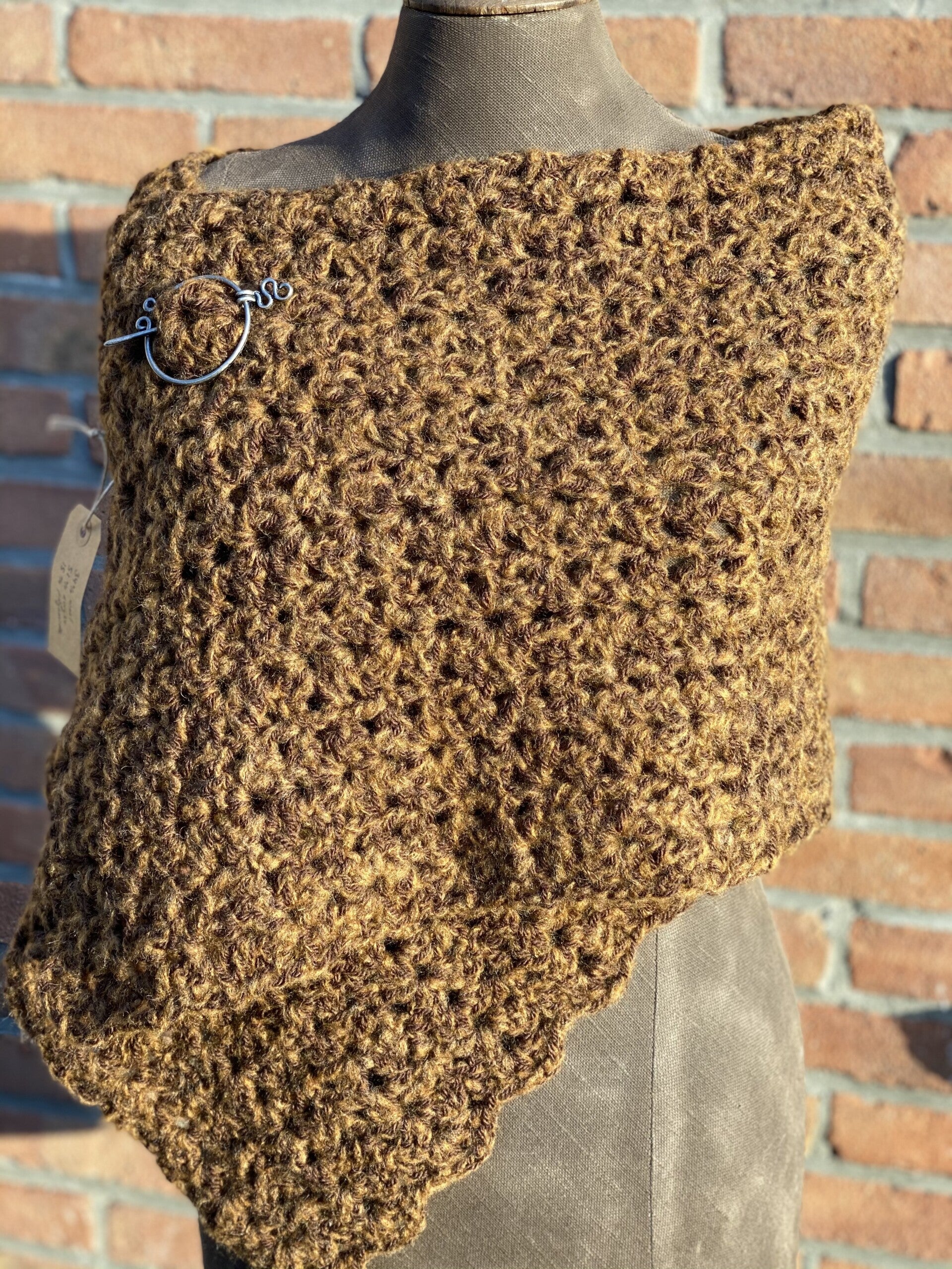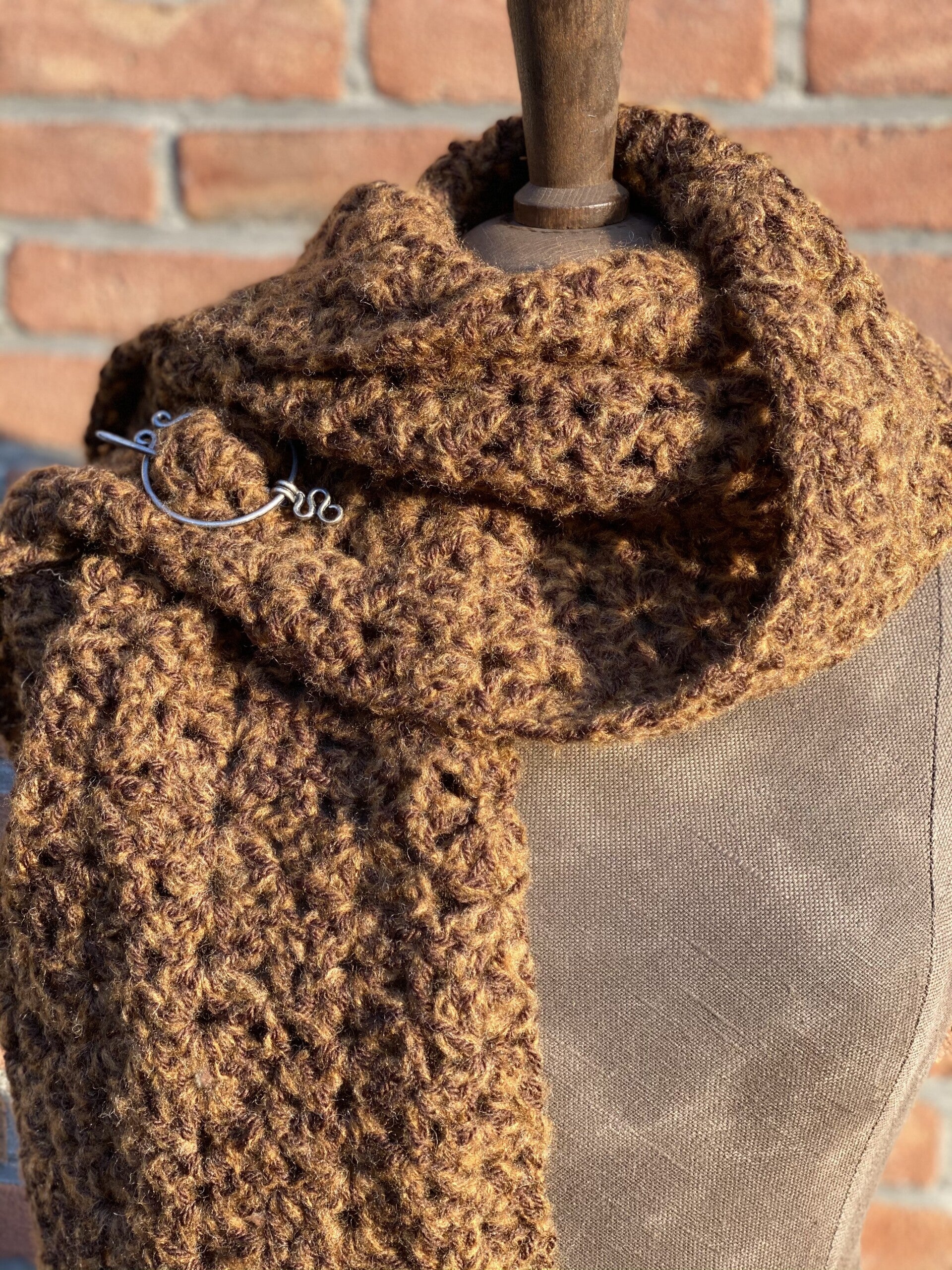 Heerlijke Hope sjaal, een beetje chunky, in een donkere karamel kleur. Gemaakt om even over je schouders te gooien of juist om je hals onder (of boven) je jas te dragen. Wordt geleverd met een pin, een fibula.