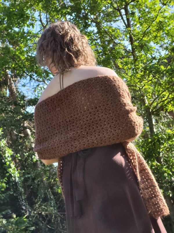 Lichte en sierlijke, bruine sjaal met een klein glanzend draadje. Gemaakt om even over je schouders te gooien of juist om je hals onder (of boven) je jas te dragen. Wordt geleverd met een pin, een fibula.