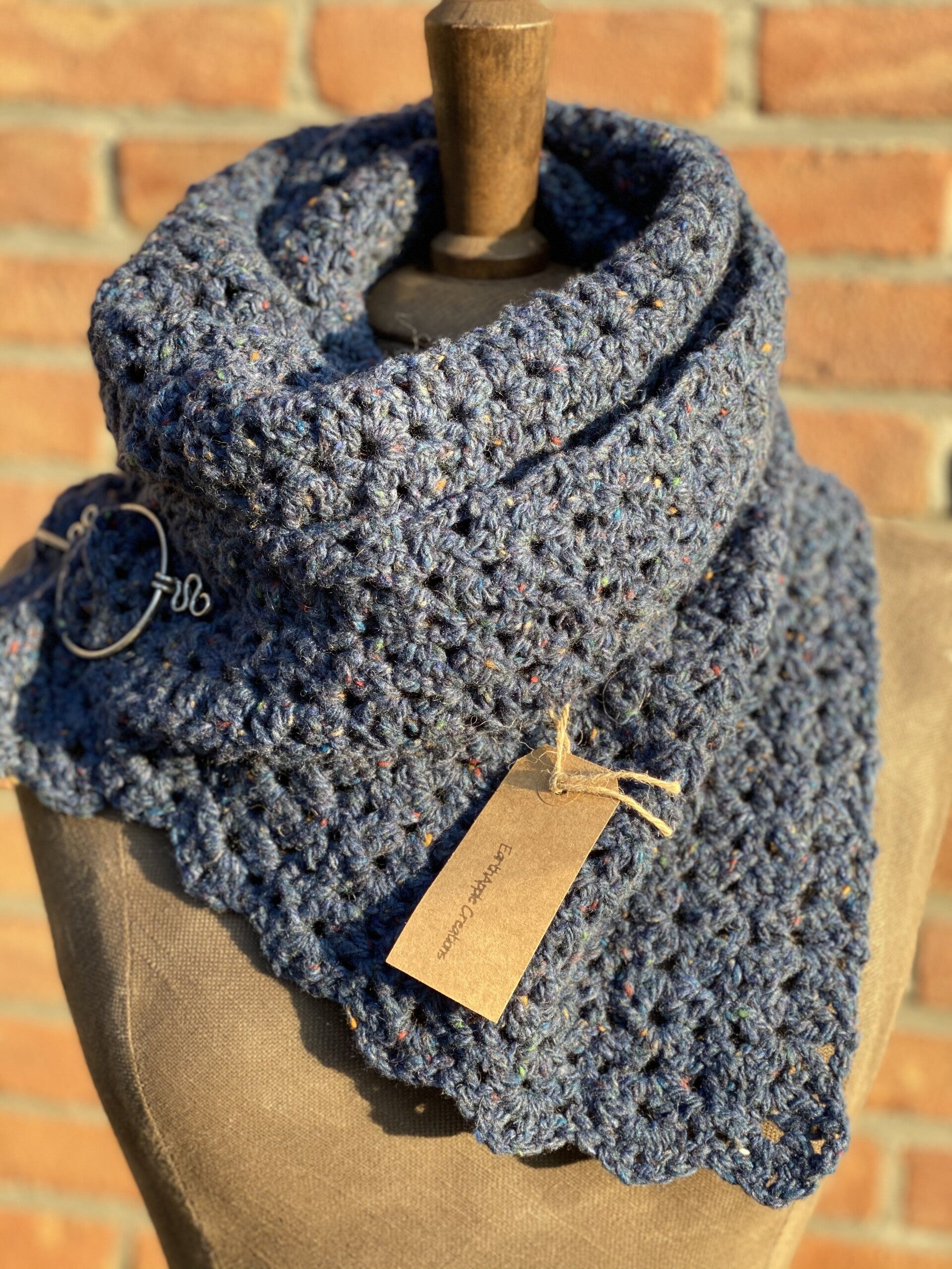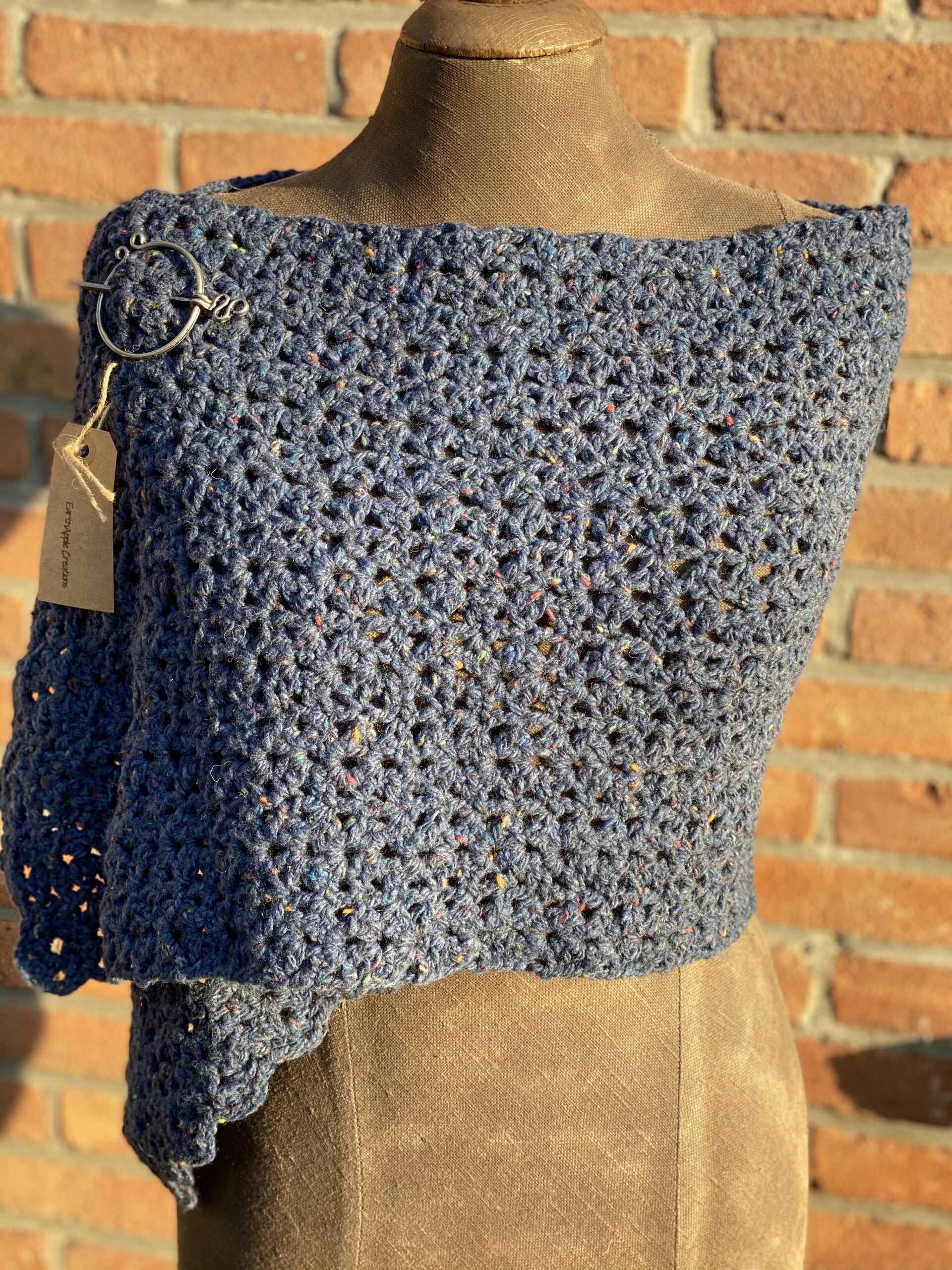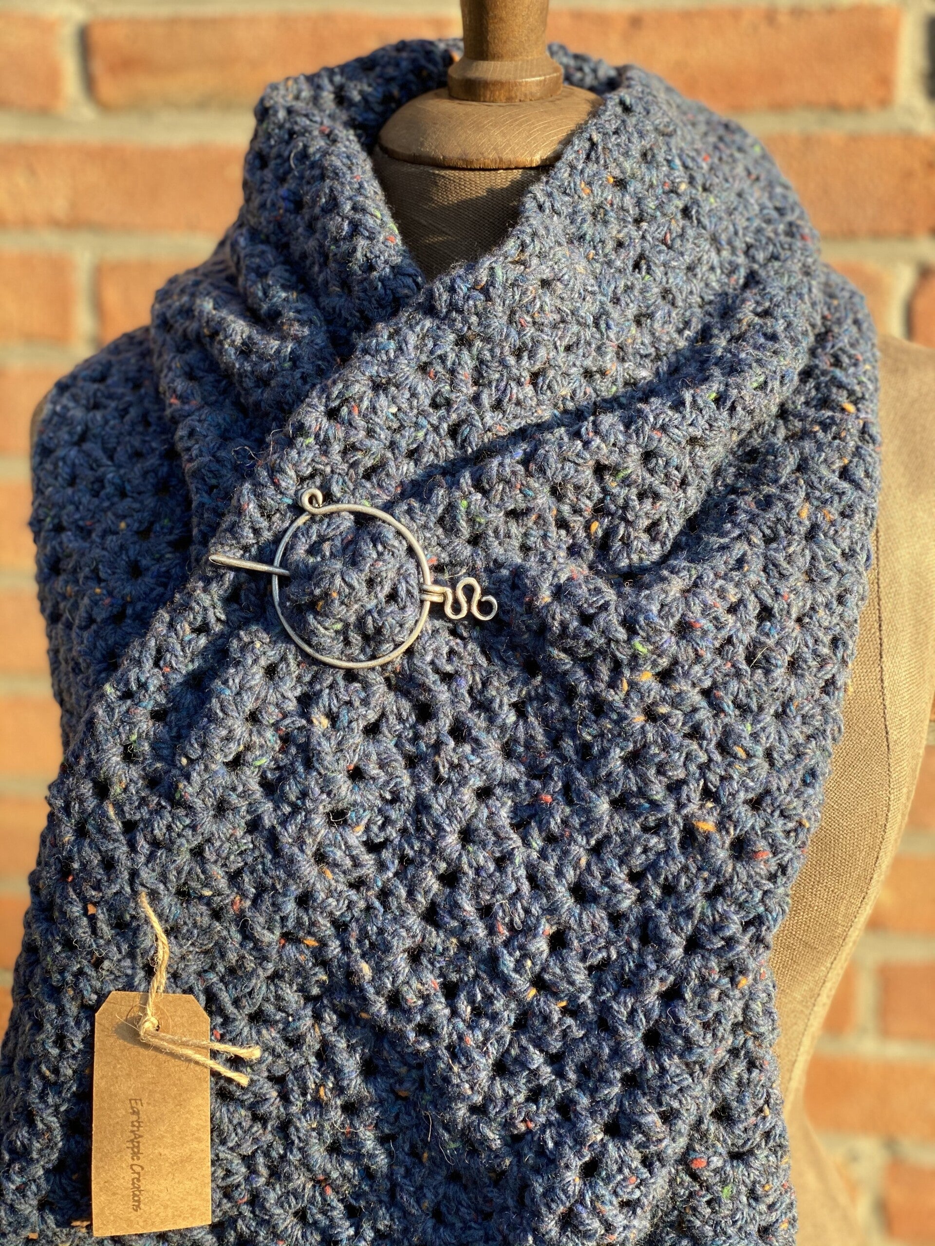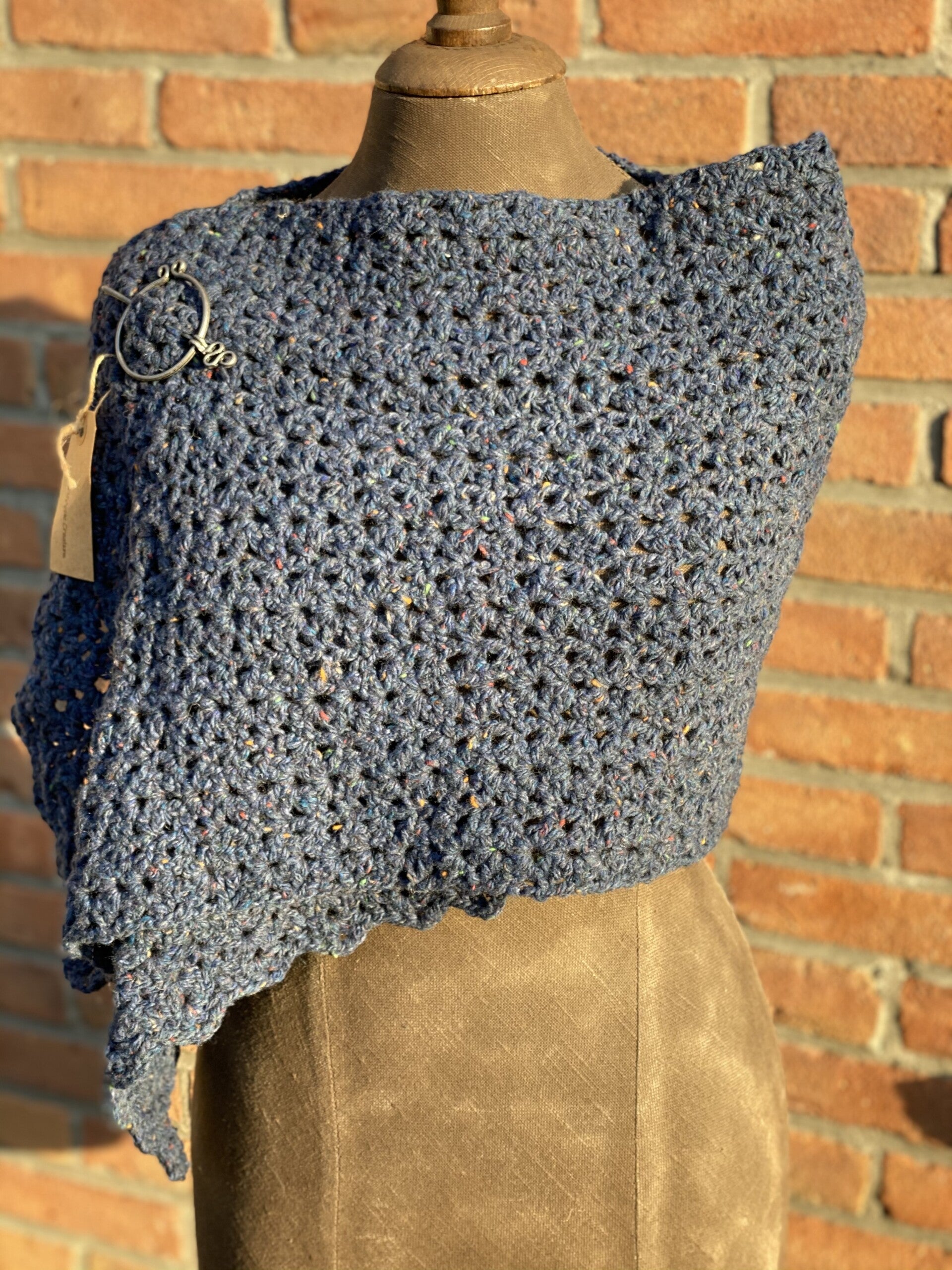 Zachte, blauwe sjaal met een hele kleine kleur effecten, van een hele prettige mengsel van wol en viscose. Gemaakt om even over je schouders te gooien of juist om je hals onder (of boven) je jas te dragen. Wordt geleverd met een pin, een fibula.