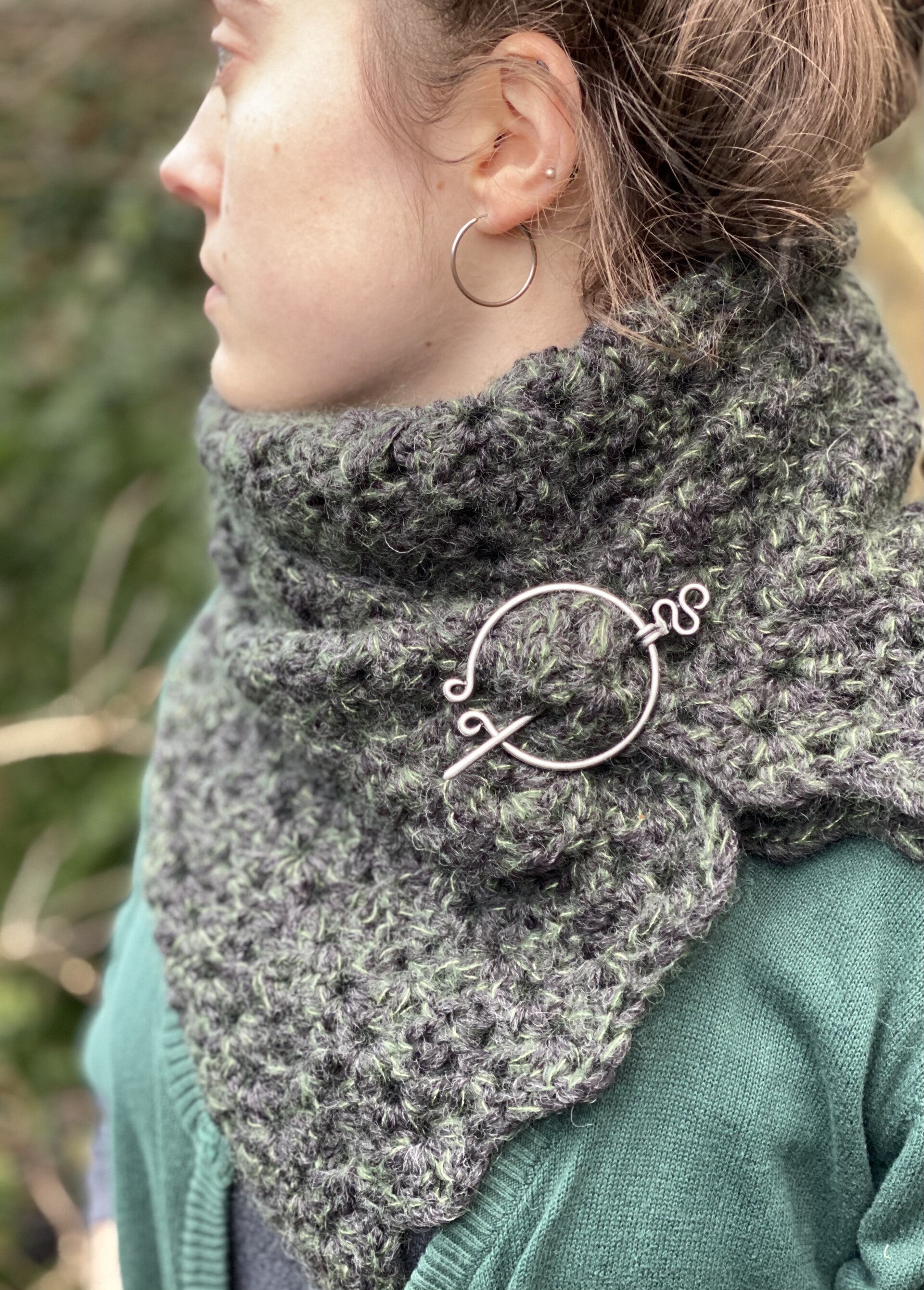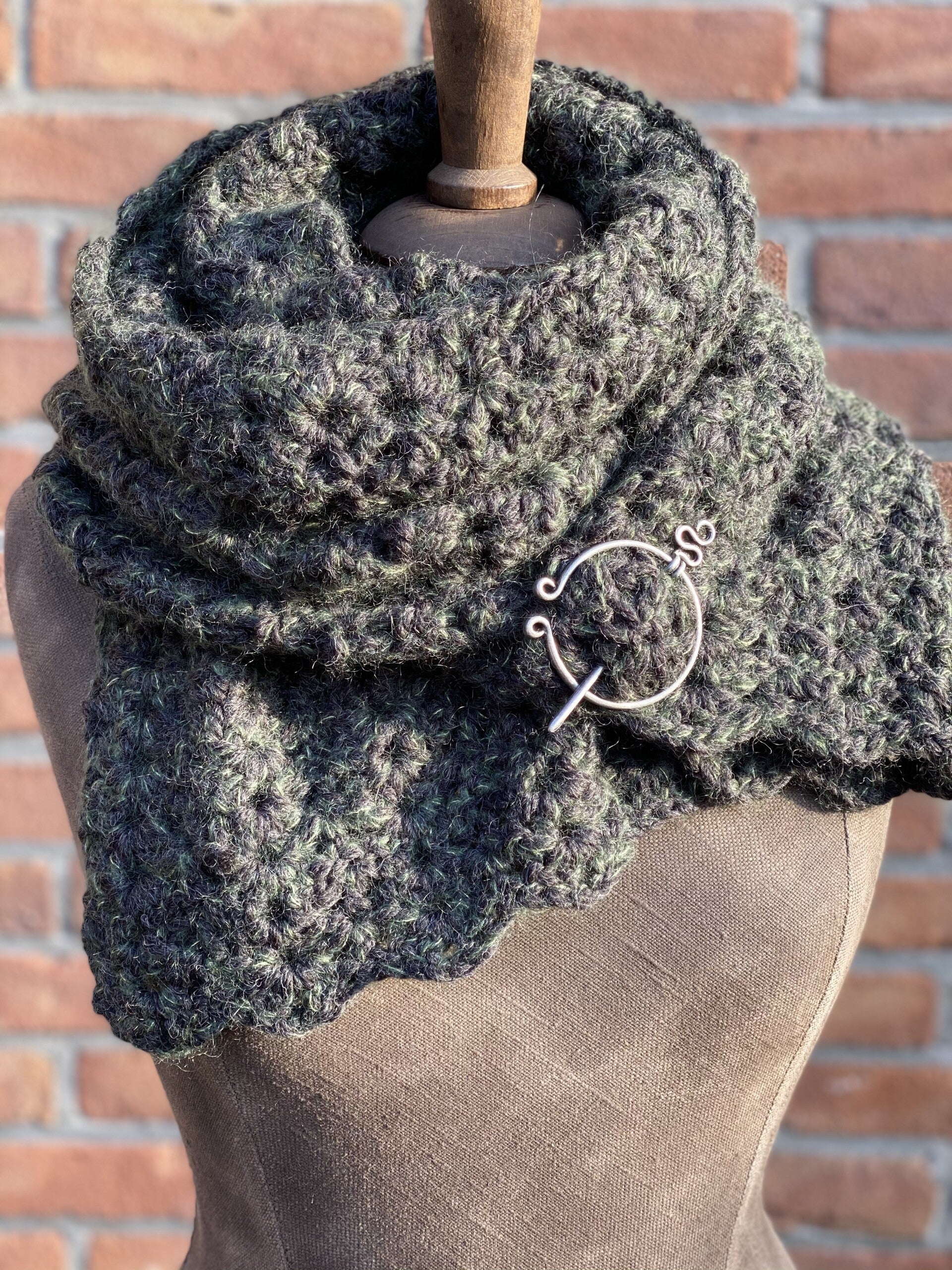 Lichte en sierlijke, groene sjaal met een klein glanzend draadje. Gemaakt om even over je schouders te gooien of juist om je hals onder (of boven) je jas te dragen. Wordt geleverd met een pin, een fibula.