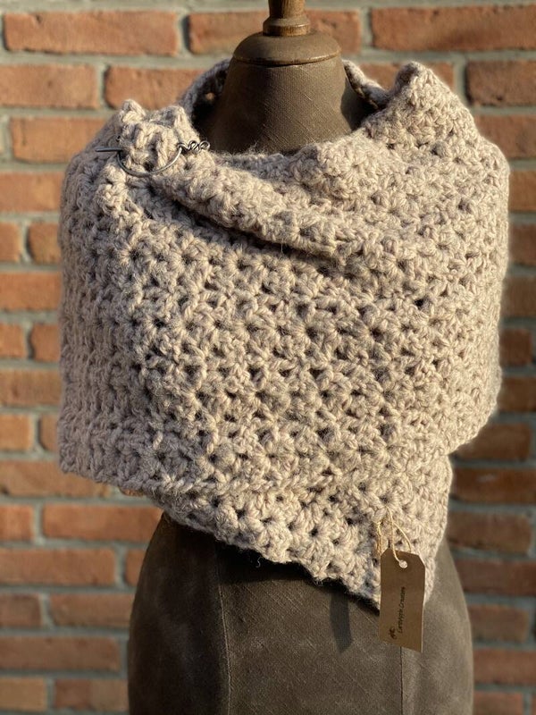 Lichte en sierlijke, grijs-beige sjaal met een klein glanzend draadje. Gemaakt om even over je schouders te gooien of juist om je hals onder (of boven) je jas te dragen. Wordt geleverd met een pin, een fibula.