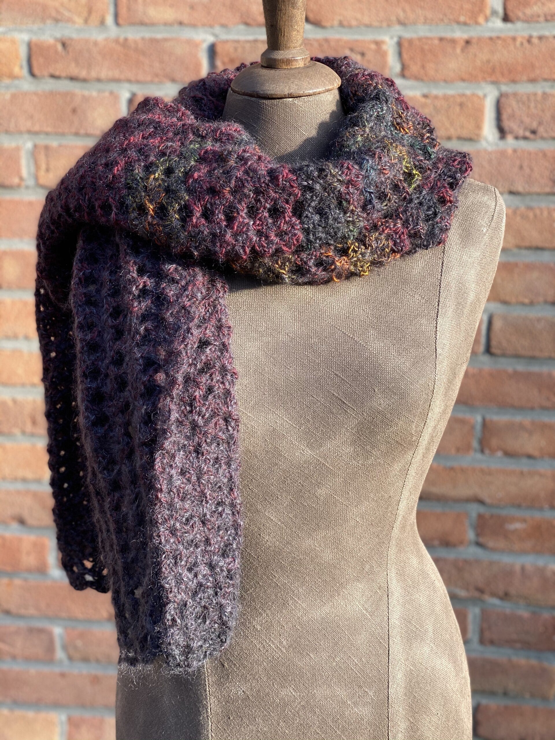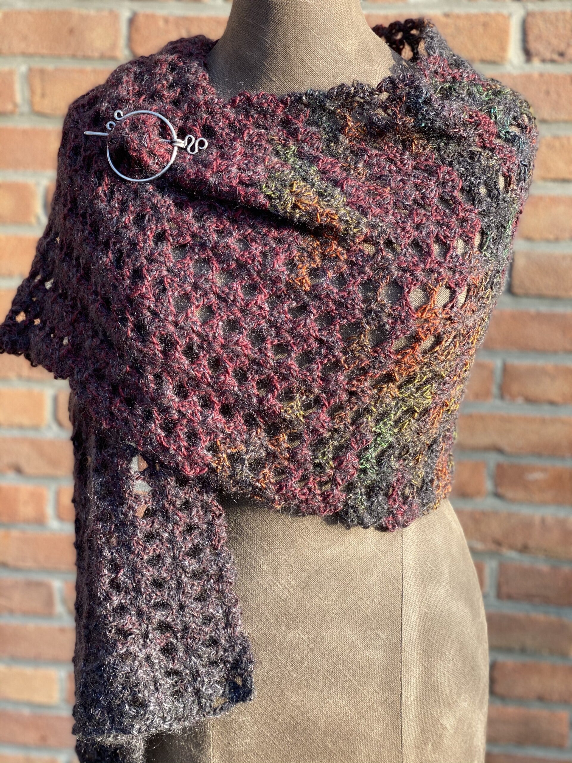 Lichte en sierlijke, bordeaux sjaal met kleureffecten en een klein glanzend draadje. Gemaakt om even over je schouders te gooien of juist om je hals onder (of boven) je jas te dragen. Wordt geleverd met een pin, een fibula.
