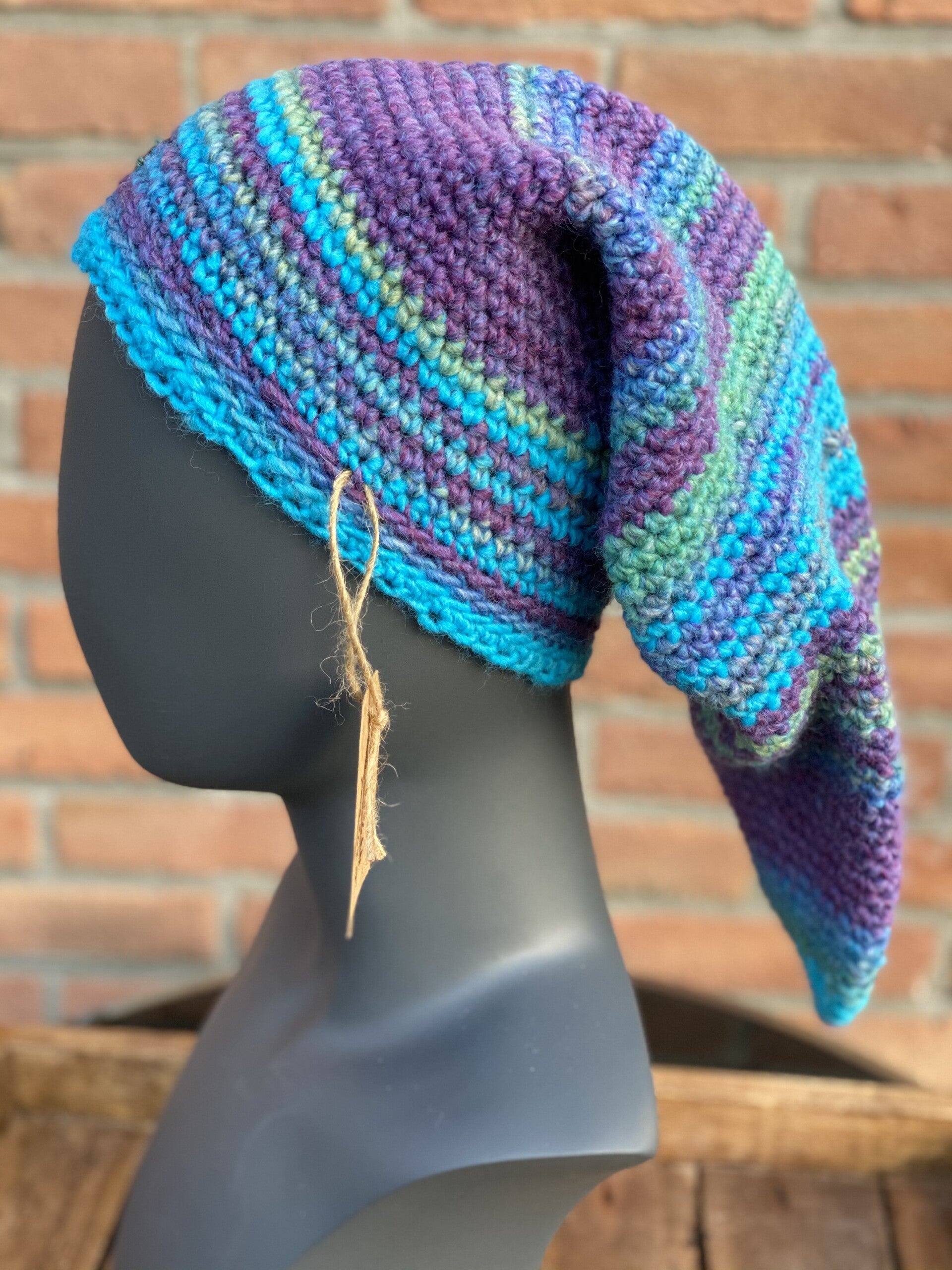Wonderfully long, pointy beanie, shaped like the hats worn by Link in Zelda, and by the Danish "nisser": The little men and women who used to tease farmers, and who later, after the invention of Santa Claus, decided to help him. A whimsical beanie all in all.