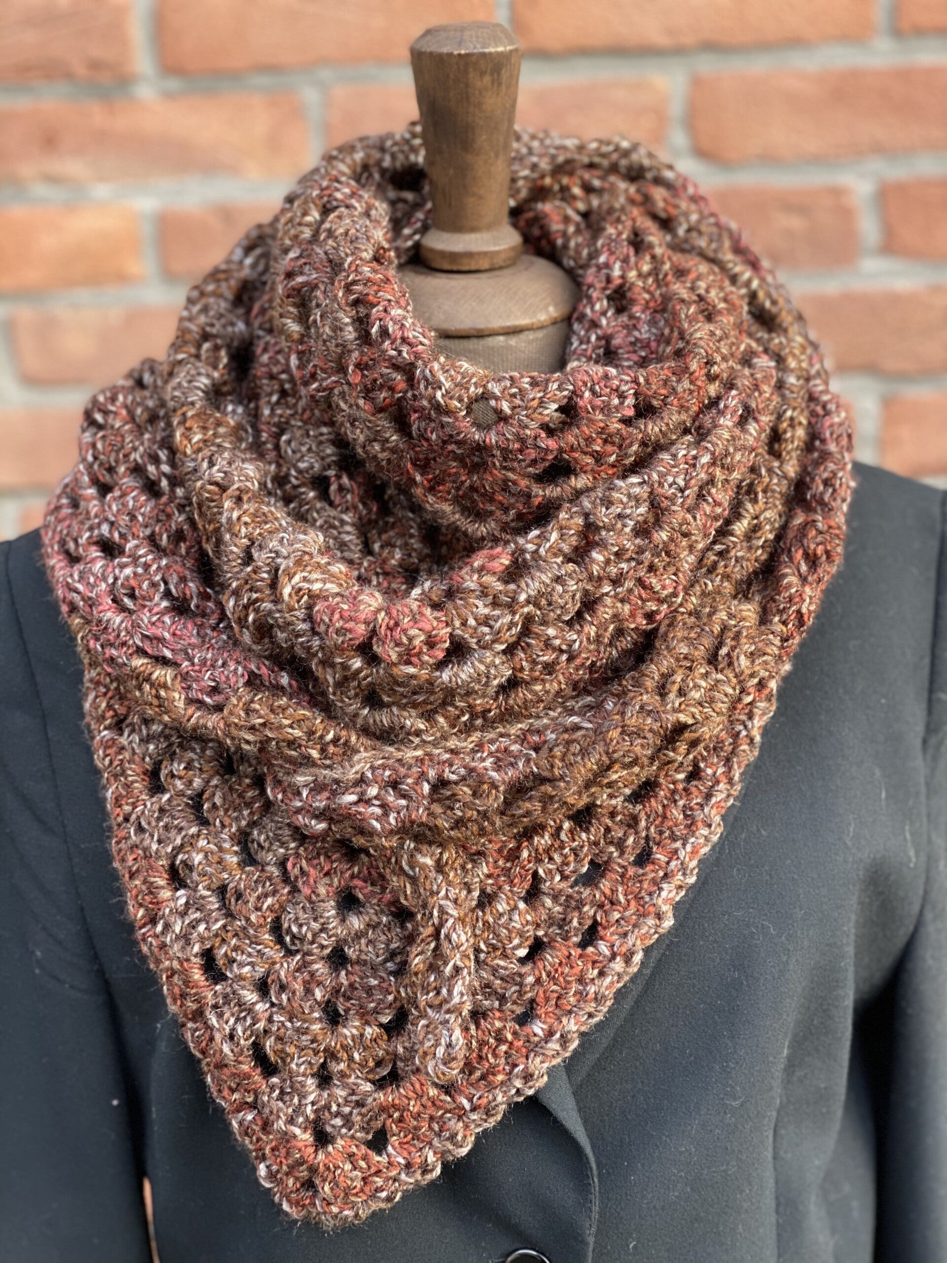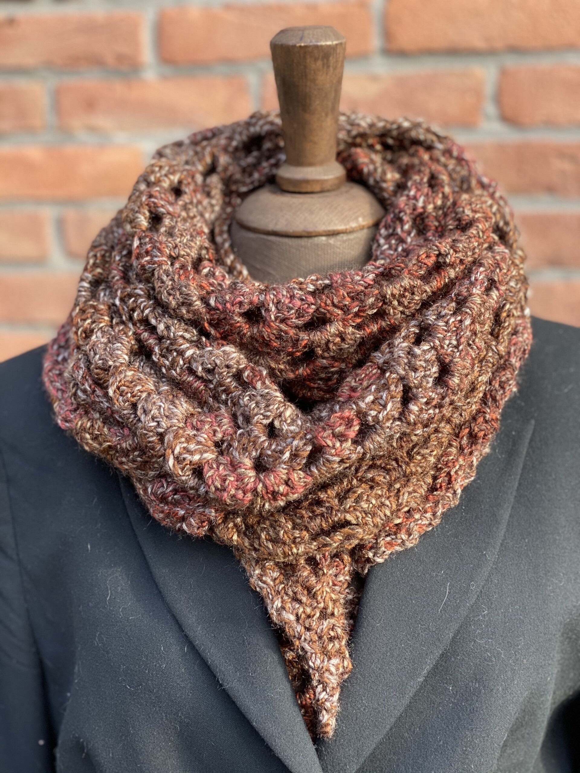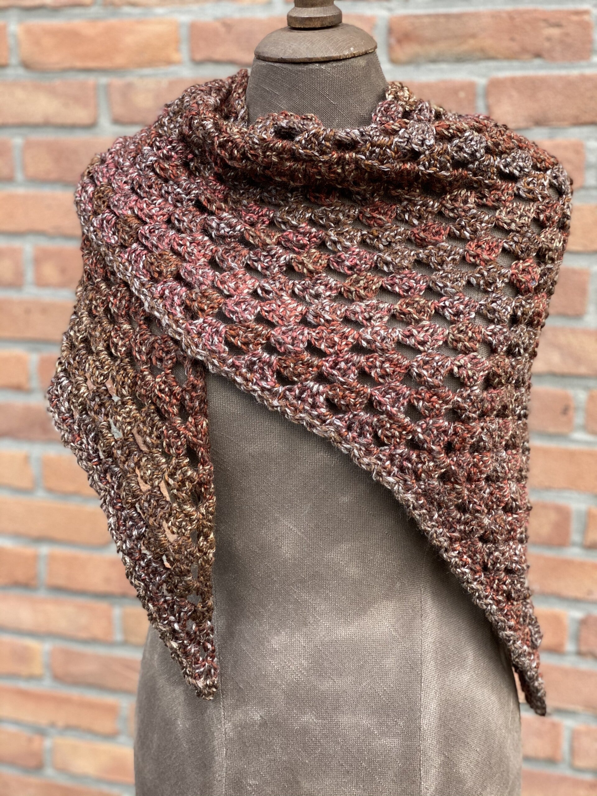 Deze knuffel-sjaal is heel licht en ook heel makkelijk. Je kunt hem als omslagdoek gebruiken, of als sjaal om de hals met de punt naar voren. Hij vormt makkelijk, en heeft extra lange 'vleugels' zodat de knoop blijft zitten. Hij is speciaal gemaakt in garen zonder wol.