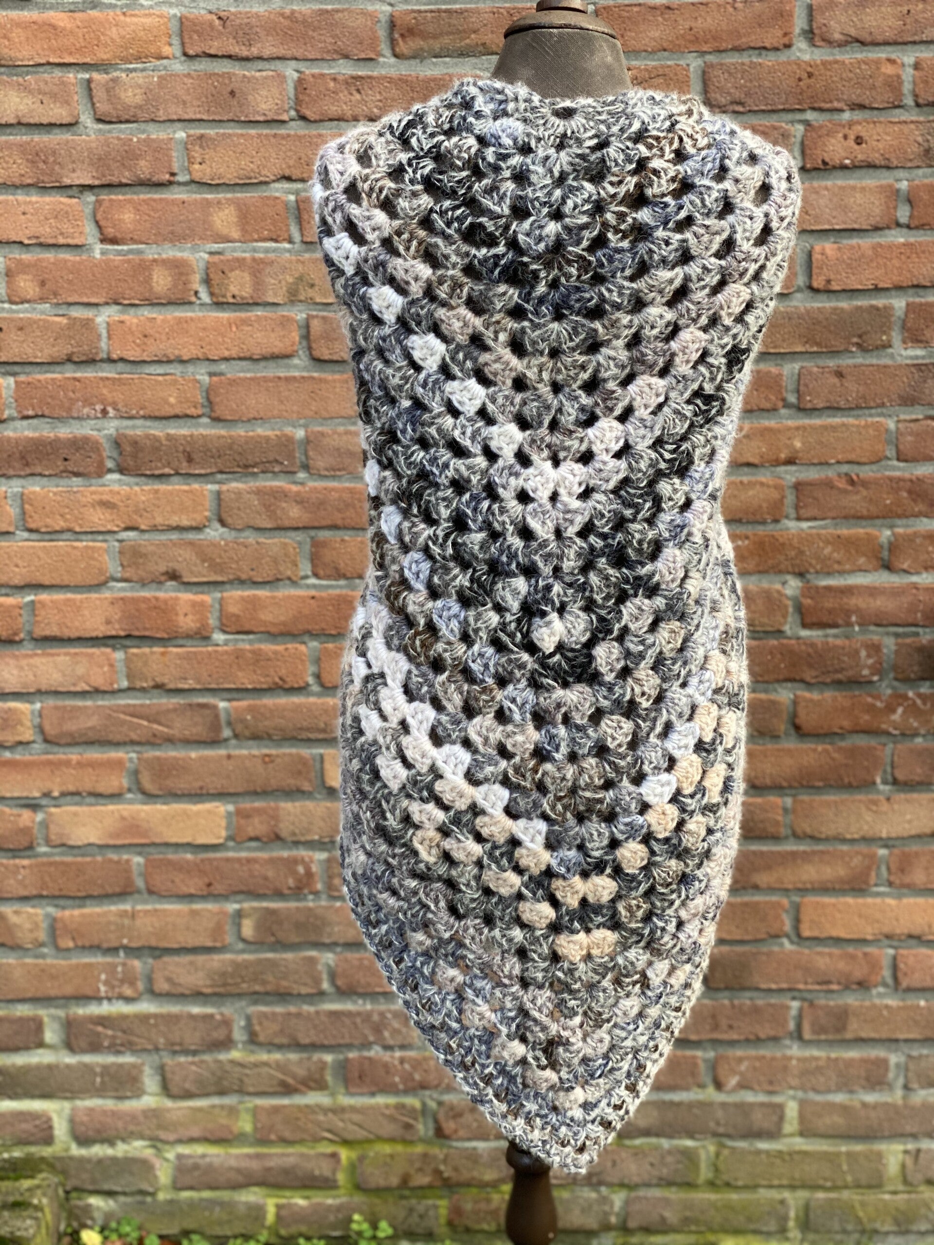 Driehoekige, supergrote omslagdoek, extreem zacht door de combinatie van drie verschillende draden. Hij is net een vacht, met nuances van grijs en bruin. Ondanks de grootte van de doek voelt hij in het geheel niet zwaar aan, maar gewoon warm en prettig - echt een knuffel.