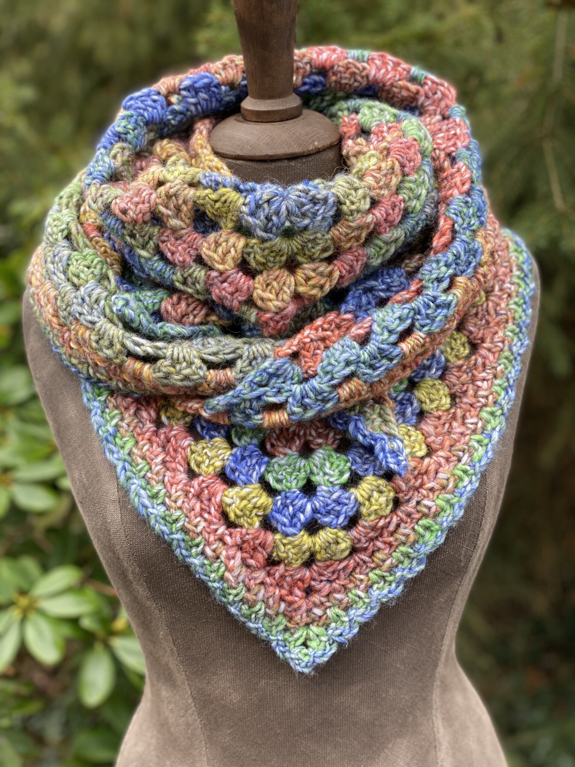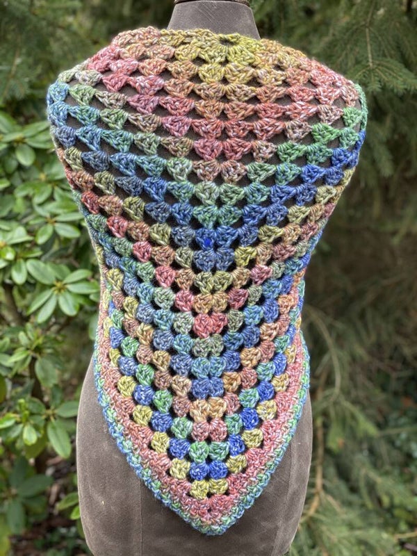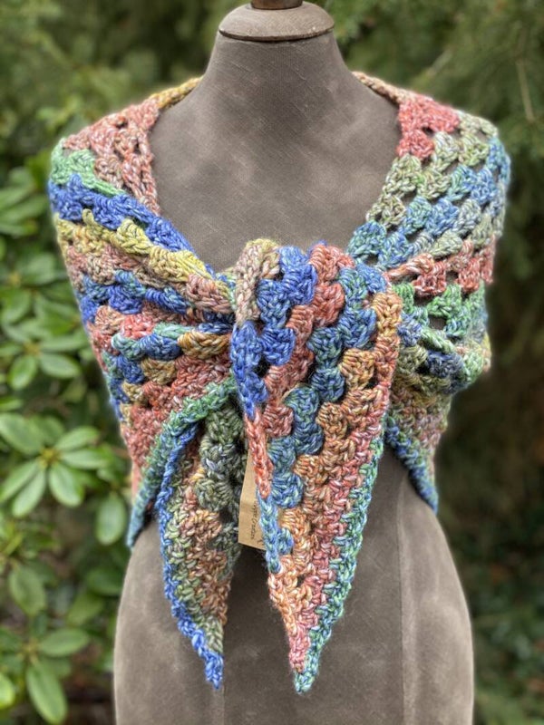 Lichte en super zachte driehoekige sjaal montere kleuren. Gemaakt om in voorjaar en zomer even over je schouders te gooien of juist andersom het hele jaar door, met de punt naar voren om je hals warm te houden.