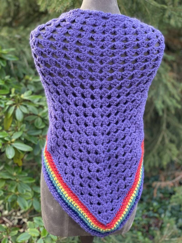 Heerlijke sjaal om vrolijk van te worden: de prachtige paarse kleur met het regenboog randje vraagt om een glimlach. Je kunt hem als omslagdoek gebruiken, maar ook als sjaal om de hals met de punt naar voren. Hij vormt makkelijk, en heeft extra lange 'vleugels' zodat de knoop blijft zitten.