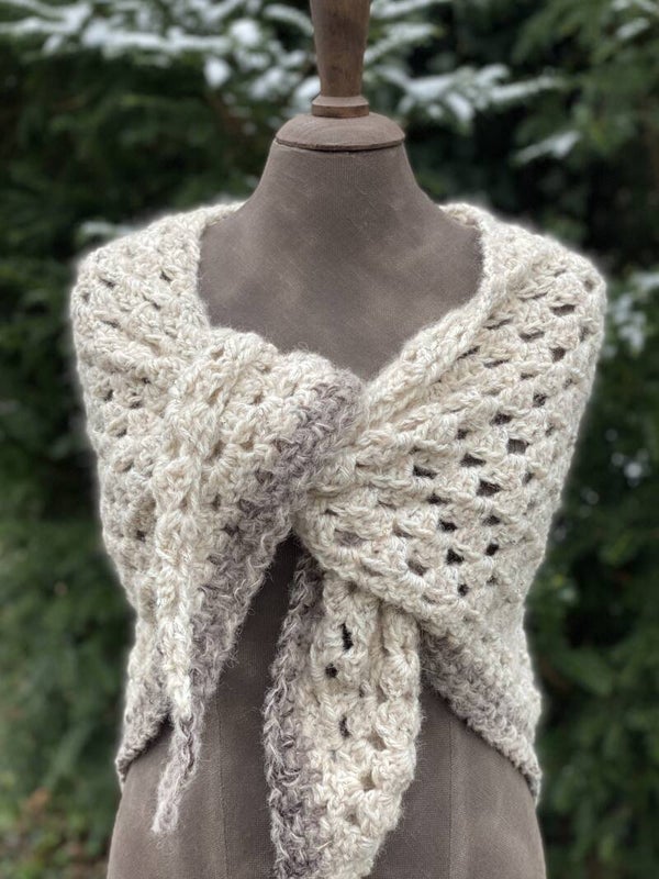 Deze knuffel-sjaal is heel licht, extreem zacht en ook heel makkelijk. Je kunt hem als omslagdoek gebruiken, of als sjaal om de hals met de punt naar voren. Hij vormt makkelijk, en heeft extra lange 'vleugels' zodat de knoop blijft zitten.