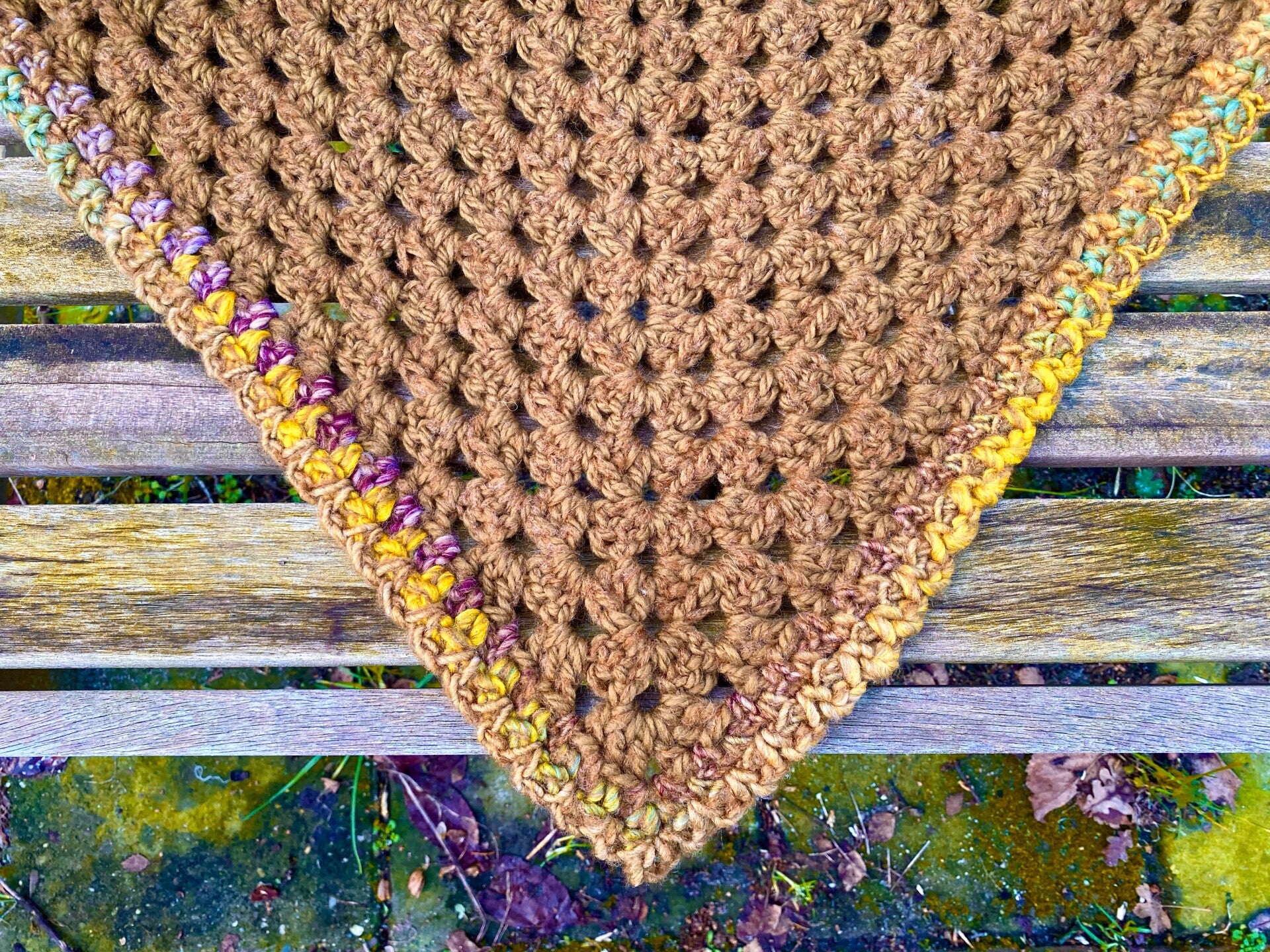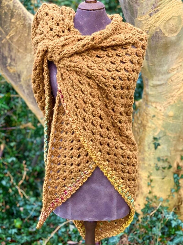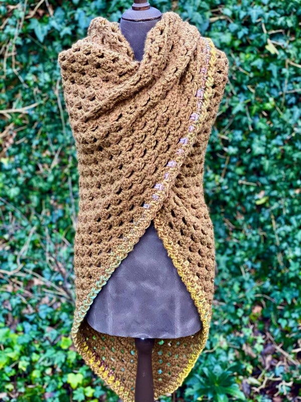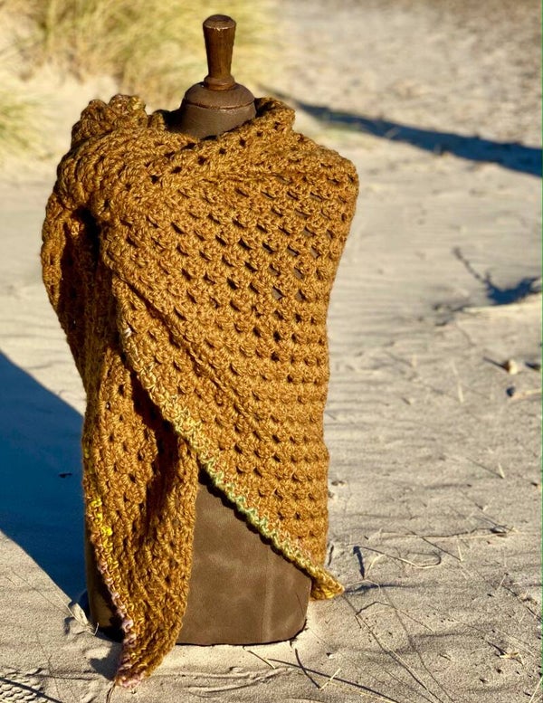 Driehoekige, supergrote omslagdoek, extreem zacht door de combinatie van diverse draden. Hij is een warme khaki-kleur met een klein randje. Zacht, warm en heel fijn om te dragen.