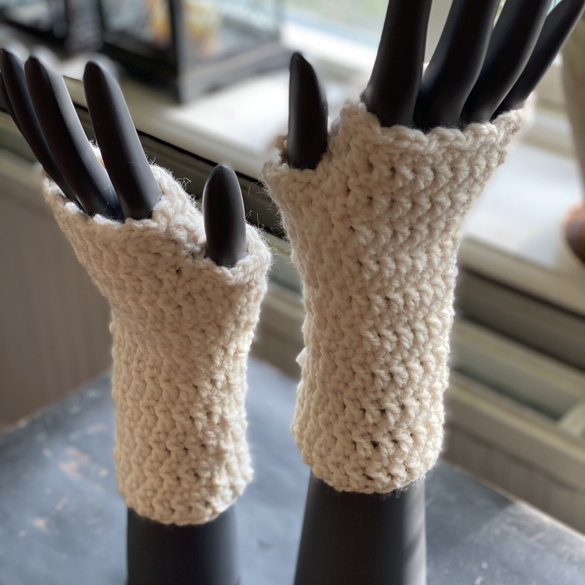 These fingerless mittens / wrist warmers with a little ‘thumb,’ are some of our most sold products: they provide convenient ways to keep your hands warm, because you do not need to take them off if you want to use your smartphone :)