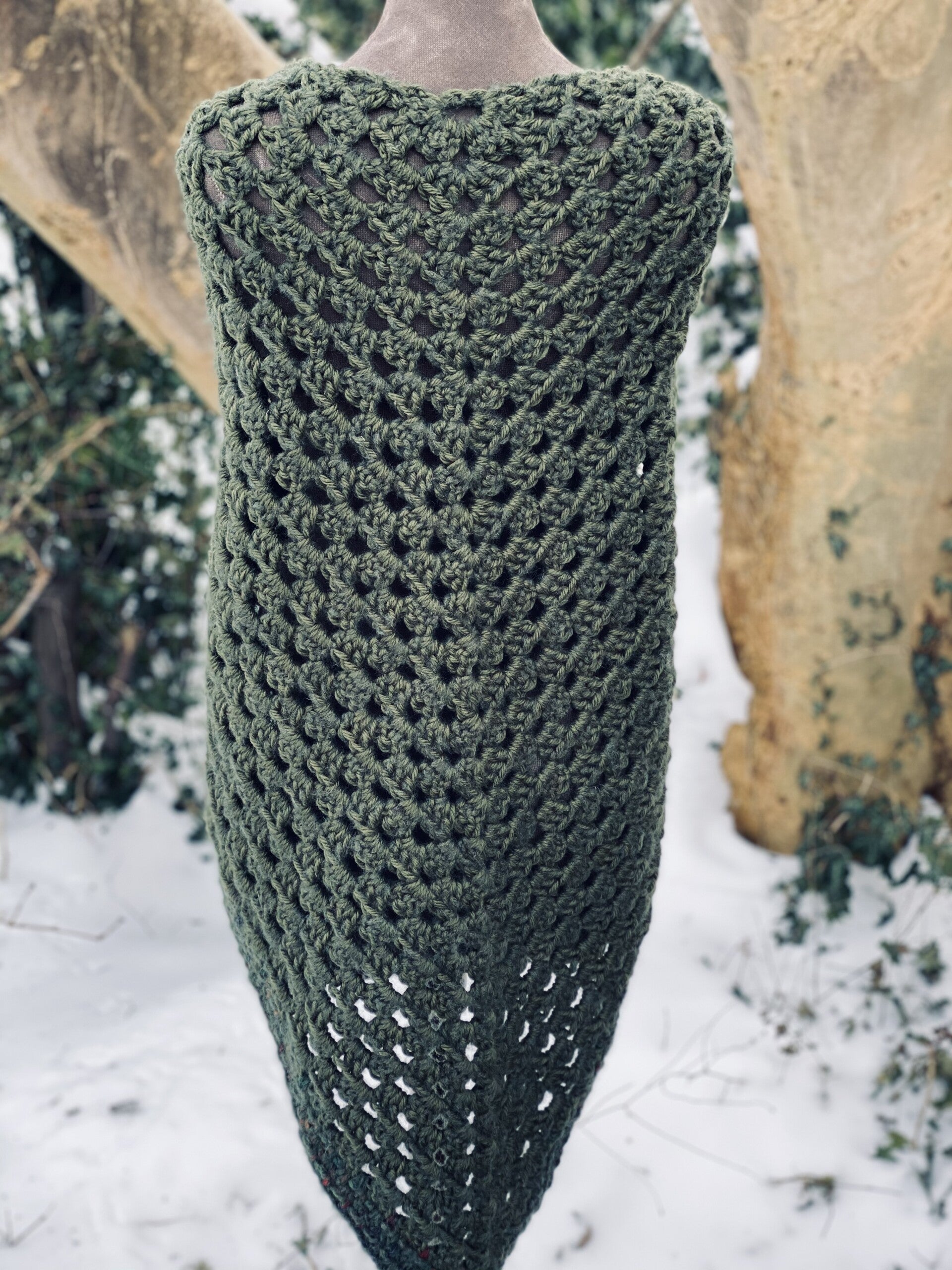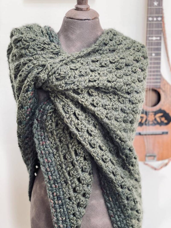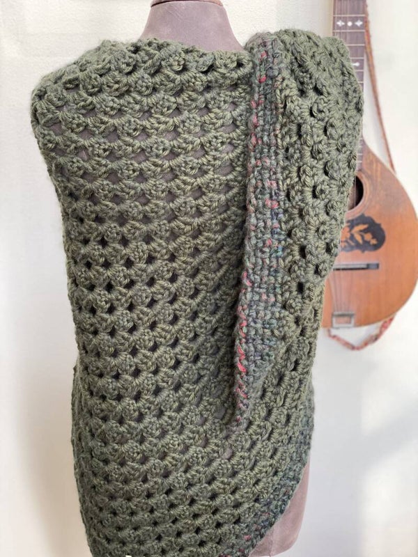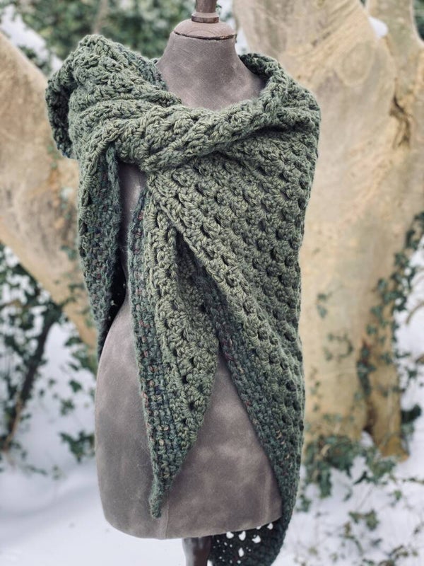 Driehoekige, supergrote omslagdoek, heel zacht door de combinatie van drie verschillende garens. Hij is heel diep donker groen en strak in het patroon, heel stijlvol. Ondanks de grootte van de doek voelt hij in het geheel niet zwaar aan, maar draagt heel prettig - echt een knuffel.