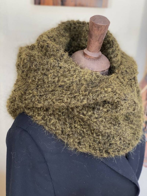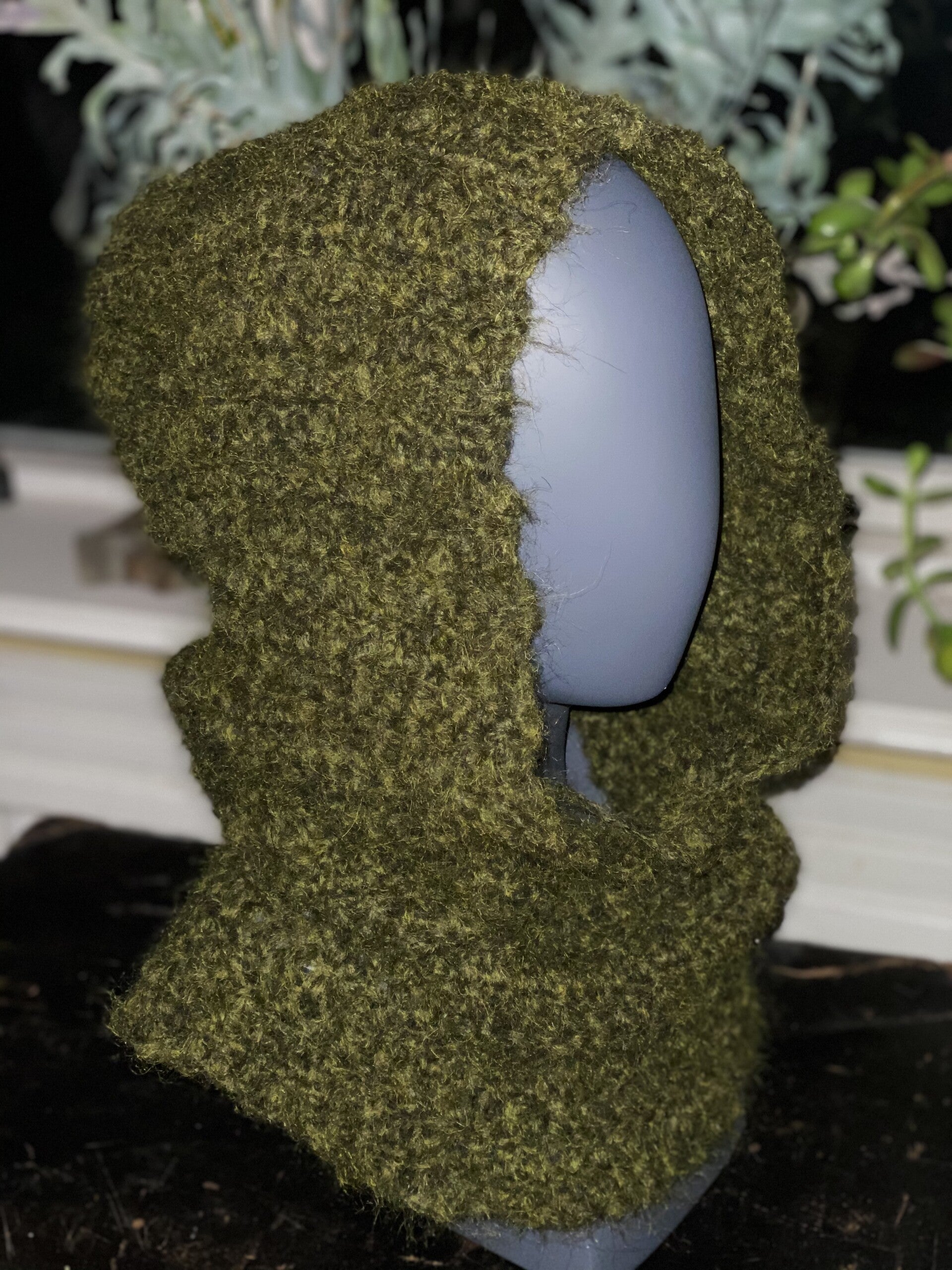 Een heerlijke hood - losse capuchon - van een super zachte garen. Hij zal in gebruik alleen maar zachter en soepeler worden. De hood is achter afgerond en de opening is ruim maar niet gigantisch. De col is taps uitlopend waardoor hij mooi ligt en zowel over als onder een jas kan.