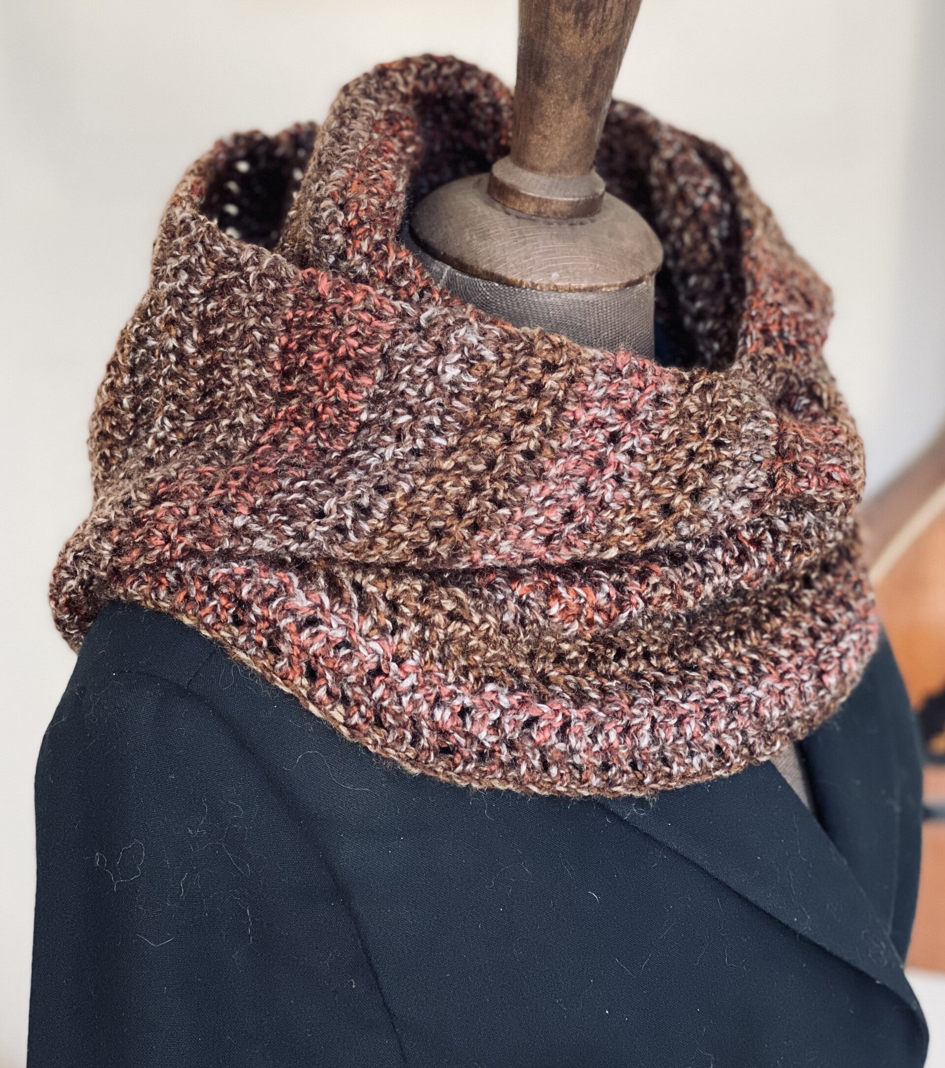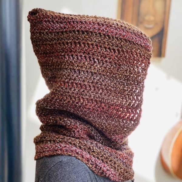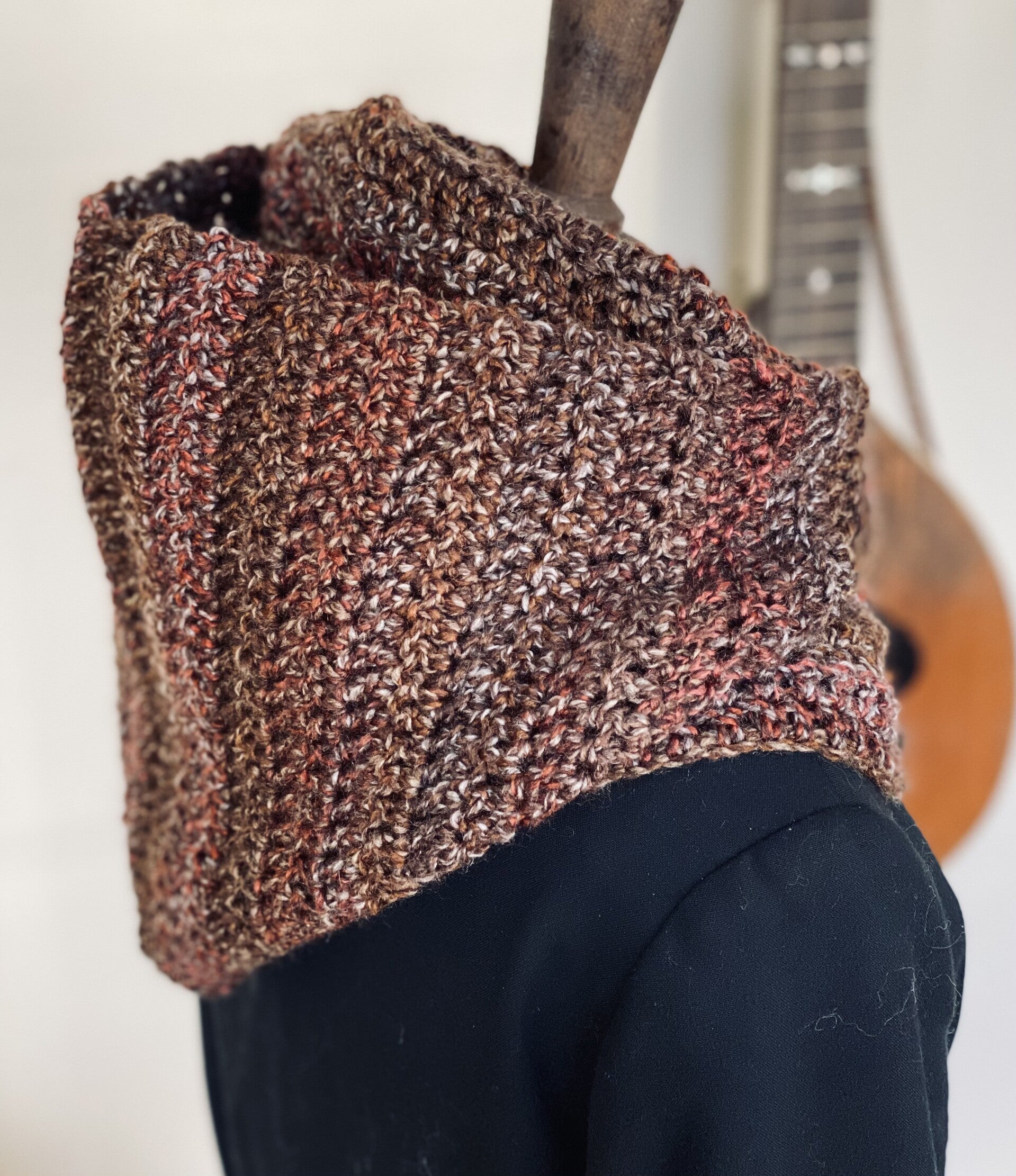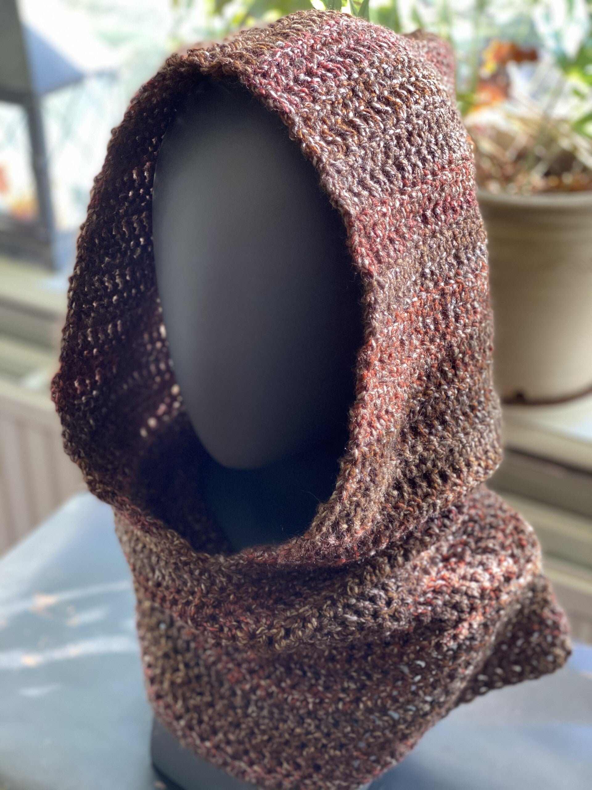 Een heerlijke hood - losse capuchon - van een fijne, gladde garen. Hij zal in gebruik alleen maar zachter en soepeler worden. De hood heeft een punt en de opening is ruim maar niet gigantisch. De col is taps uitlopend waardoor hij mooi ligt en zowel over als onder een jas kan.