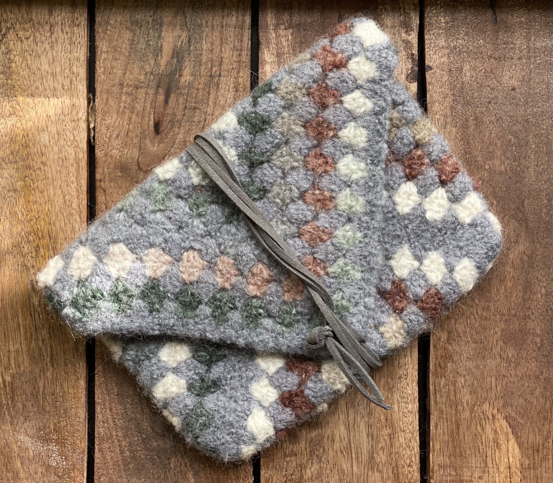 - Gehaakt van 100% wol, erna gevilt. Het koordje is van vegan / faux suede, dat gemaakt is van polyester textiel.
