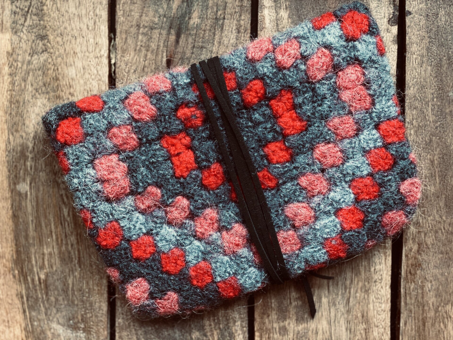 - Crocheted from 100% wool, felted afterwards. The cord is made from vegan/faux suede, which consists of polyester textile.