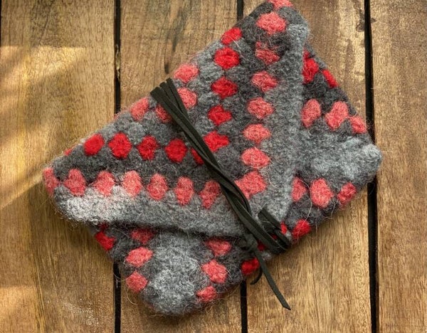 - Gehaakt van 100% wol, erna gevilt. Het koordje is van vegan / faux suede, dat gemaakt is van polyester textiel.