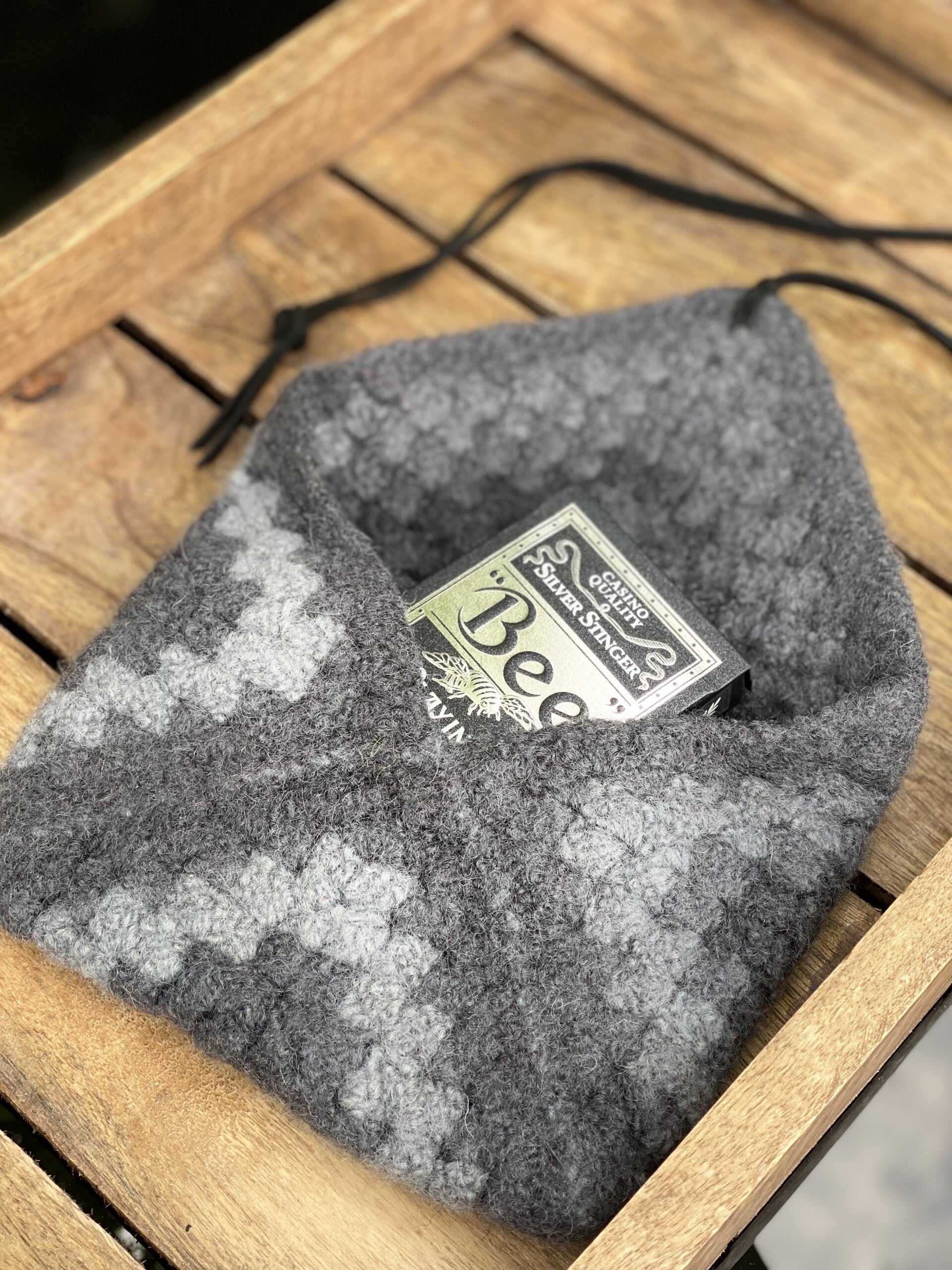 - Gehaakt van 100% wol, erna gevilt. Het koordje is van vegan / faux suede, dat gemaakt is van polyester textiel.