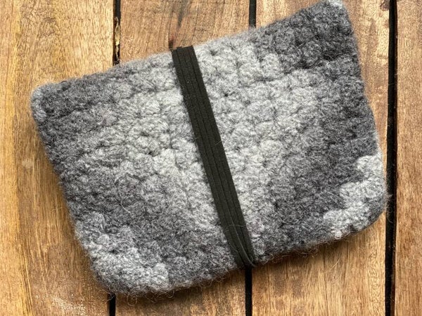 - Crocheted from 100% wool, felted afterwards. The cord is made from vegan/faux suede, which consists of polyester textile.