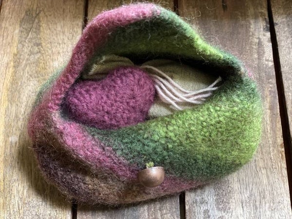 The bag is filled with comforting things for the senses, which have been handcrafted and carefully selected, just like the bag. The bag is knitted from pure wool and has been felted afterwards. It closes with a button.