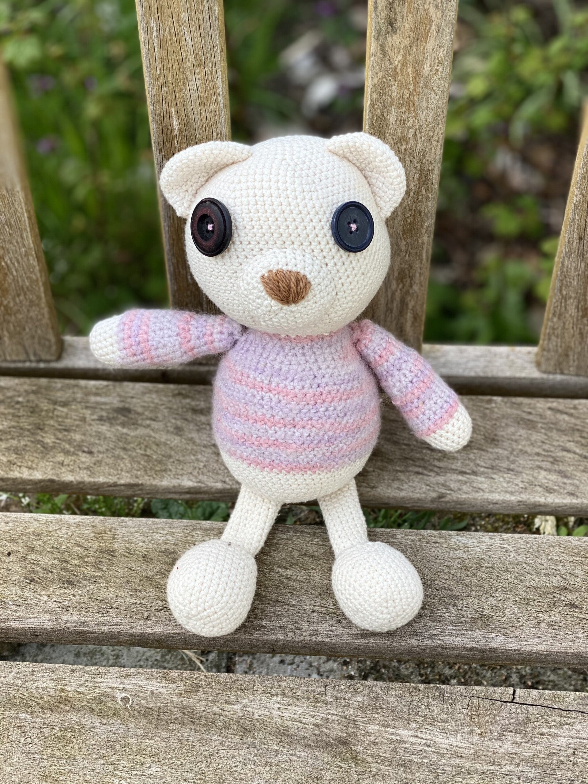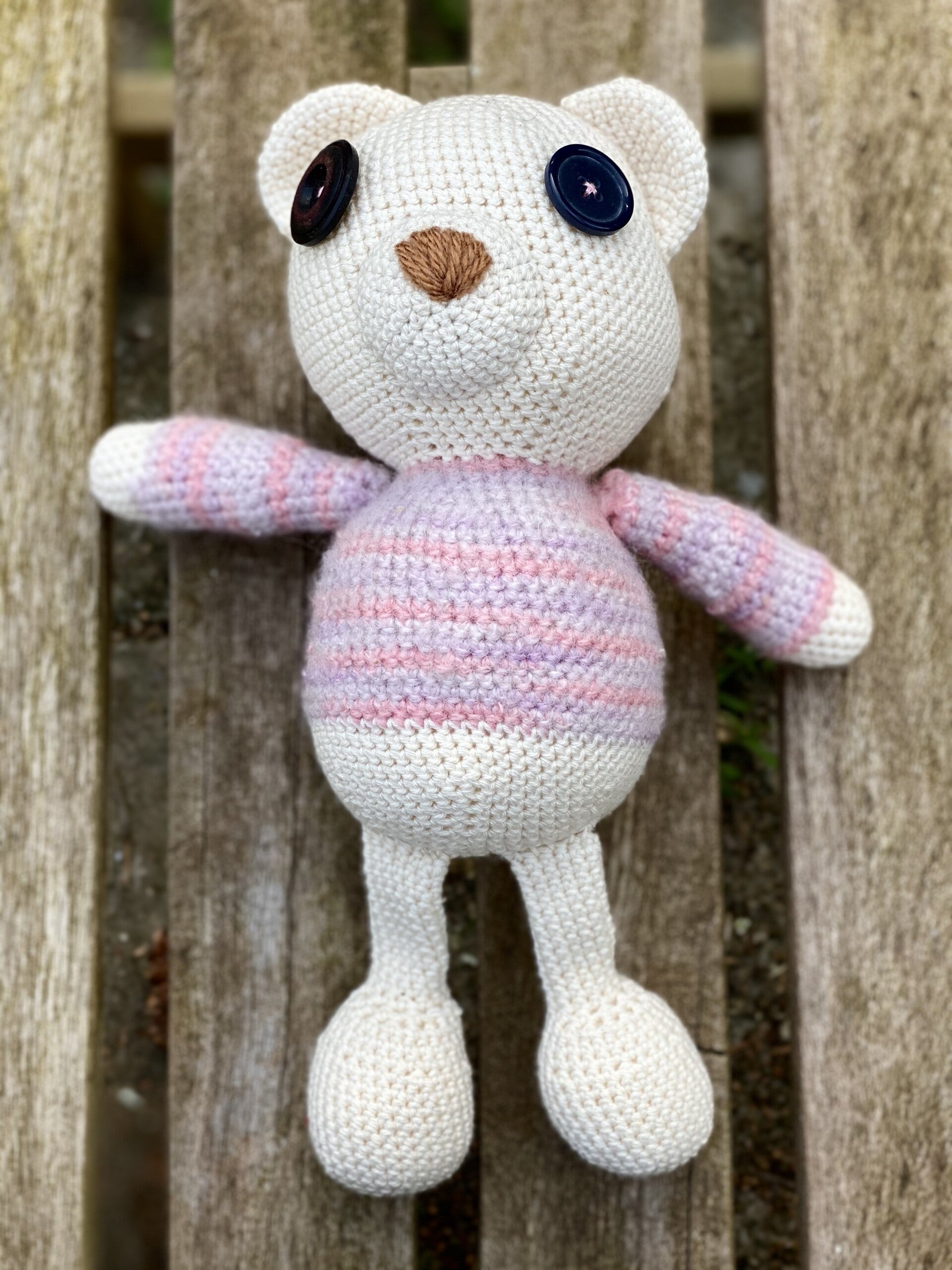 - Lijf is gehaakt van 100% katoen garen, bovenlijf van 100% acryl. Ogen zijn plastiek knopen.