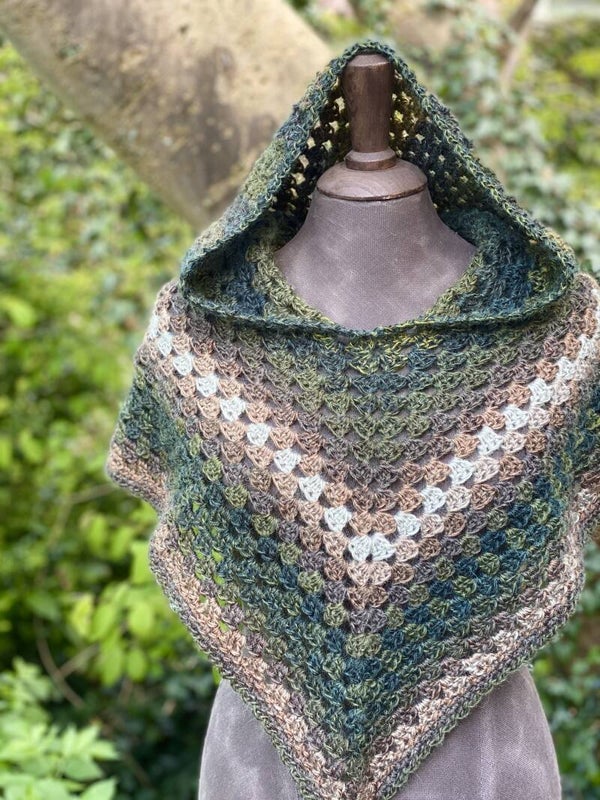 - Maten: Hood 29 cm deep and 35 cm hoog. De halsopening van de cape is ongeveer 68 cm omtrek. Van hals tot punt 44 cm, van schouder tot rand 28 cm.