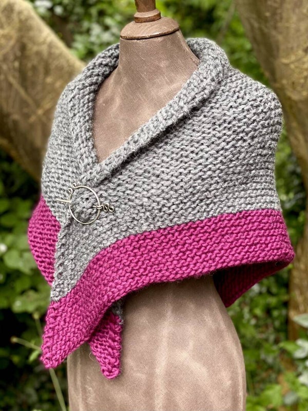 Je kunt hem als omslagdoek gebruiken zoals in de serie, maar ook als sjaal om de hals met de punt naar voren. Hij vormt makkelijk, en heeft extra lange 'vleugels' zodat de knoop blijft zitten.