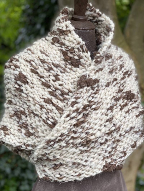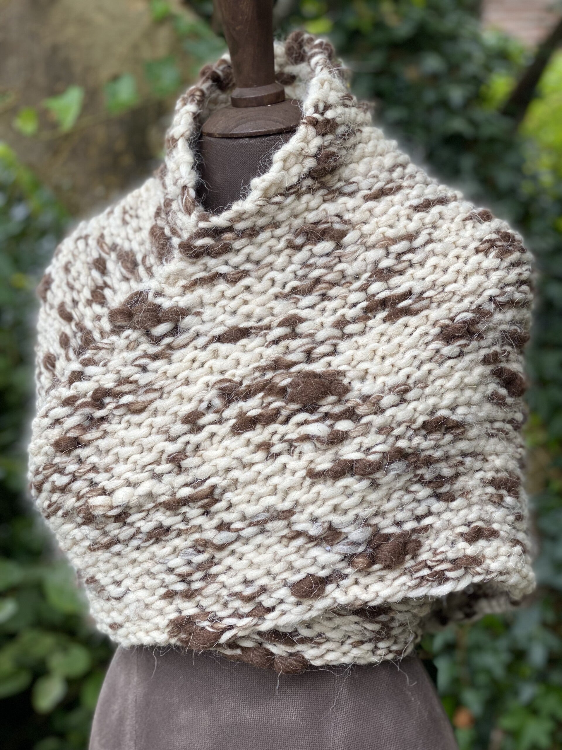 Je kunt hem als omslagdoek gebruiken zoals in de serie, zowel met de fibula ( = speld: die krijg je erbij) als met een knoop achter.
