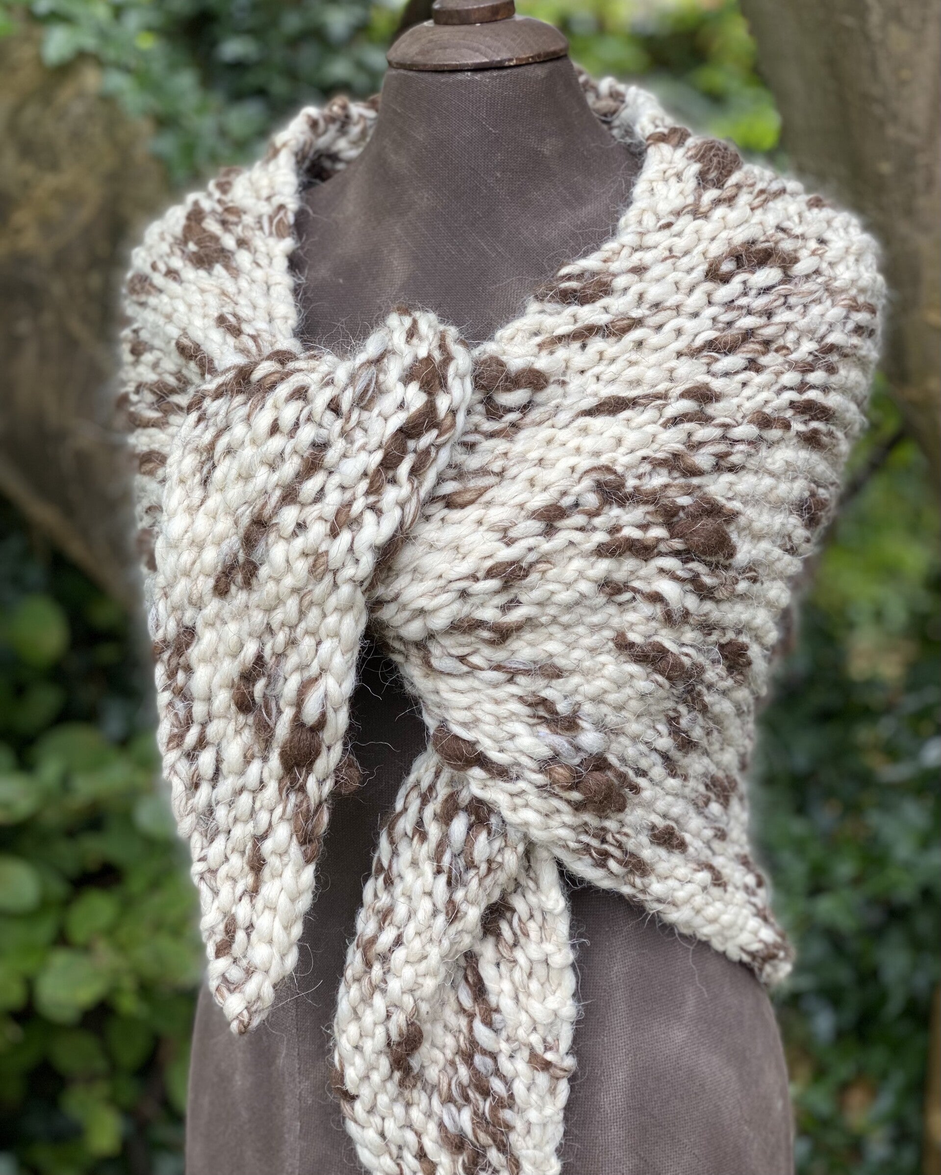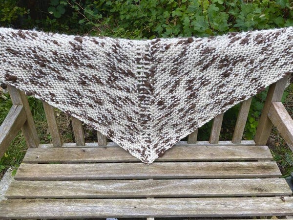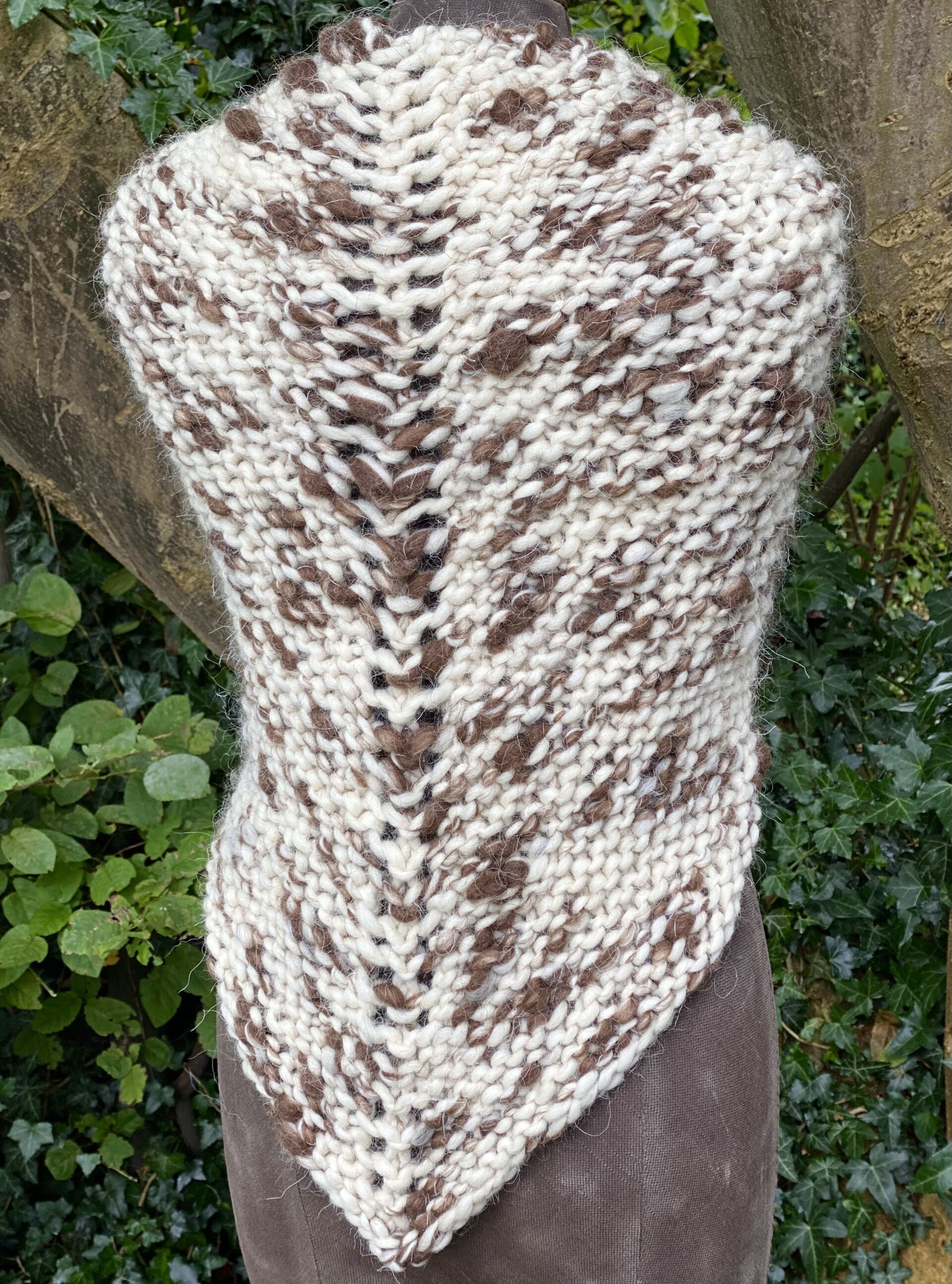 Driehoekige, middelgrote omslagdoek / sjaal, gebreid van 100% wol. Unieke wol die niet meer wordt gemaakt - de doek is en blijft dus ook écht uniek!
