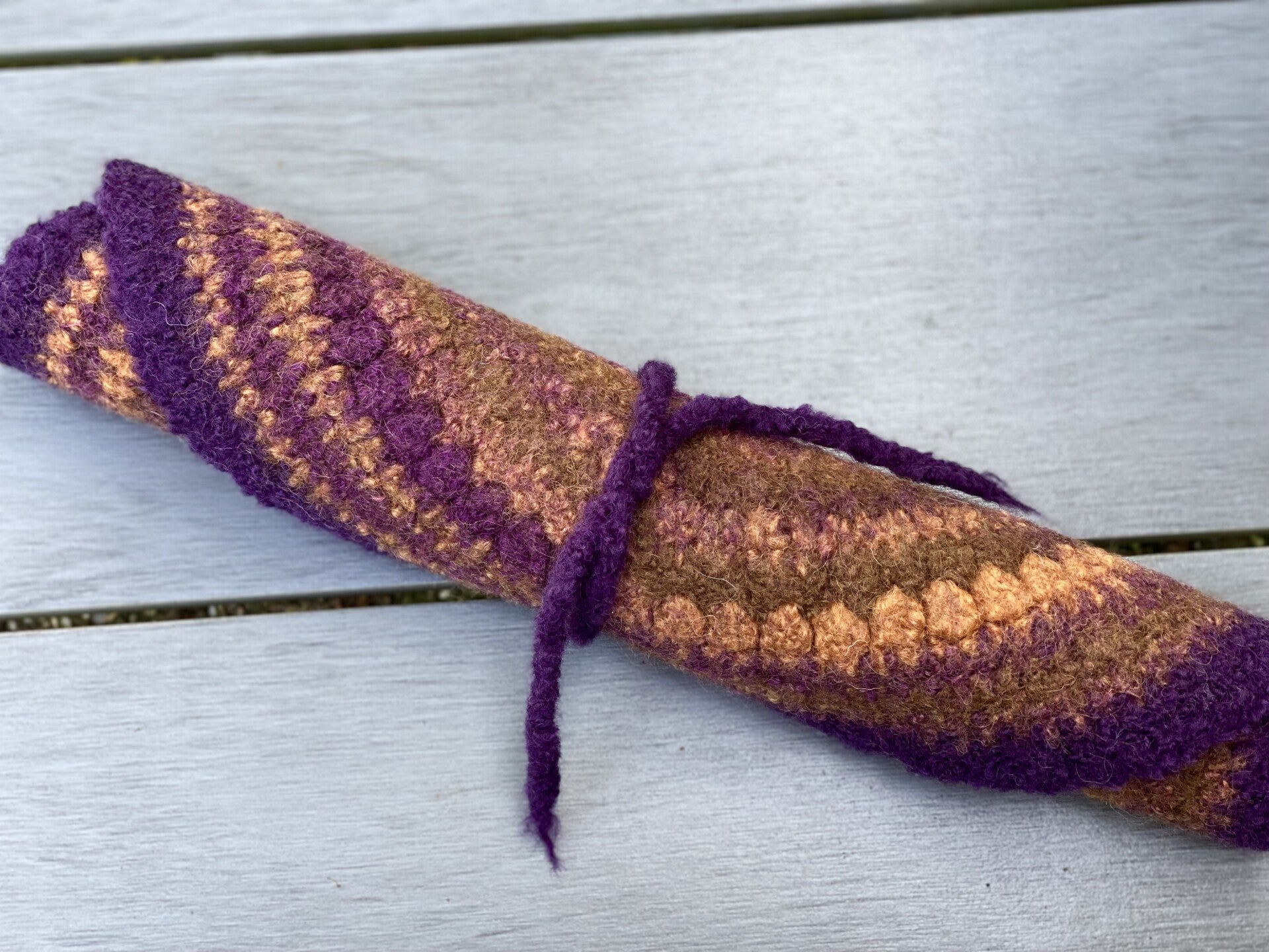 Een mooie, maar ook erg praktisch mat, geschikt voor zo'n beetje alle situaties buiten: de wollen mat is gehaakt en dan gevilt, dat maakt hem heel dicht heerlijk isolerend tegen kou van onderen. Je rolt hem zo op en bind hem met de touwtjes, dan past hij in een zijvak van een rugzak. Super voor festivals, hiking, wandelen of lekker op de tuinbank - je buiten-seizoen wordt er gewoon langer mee.