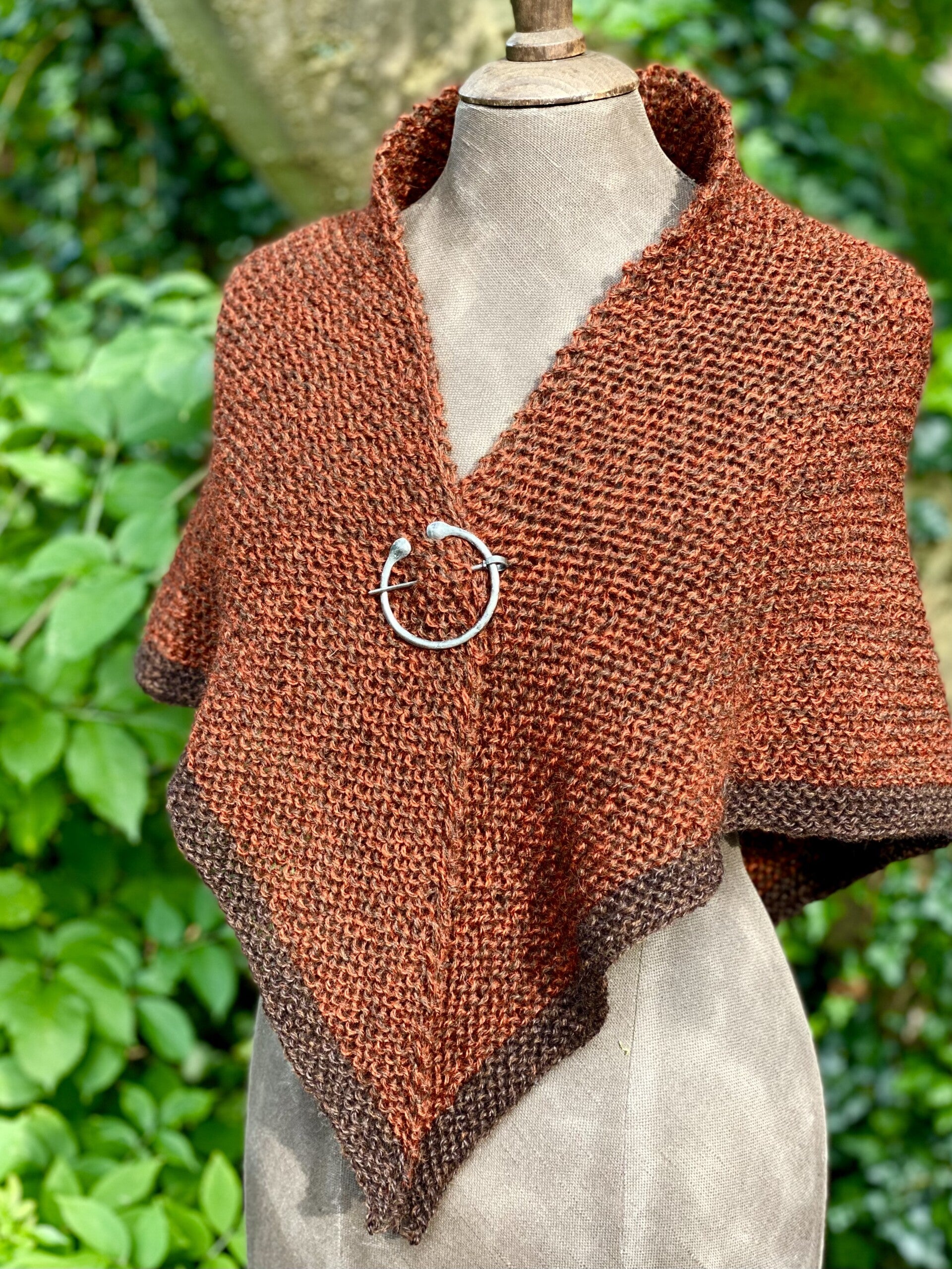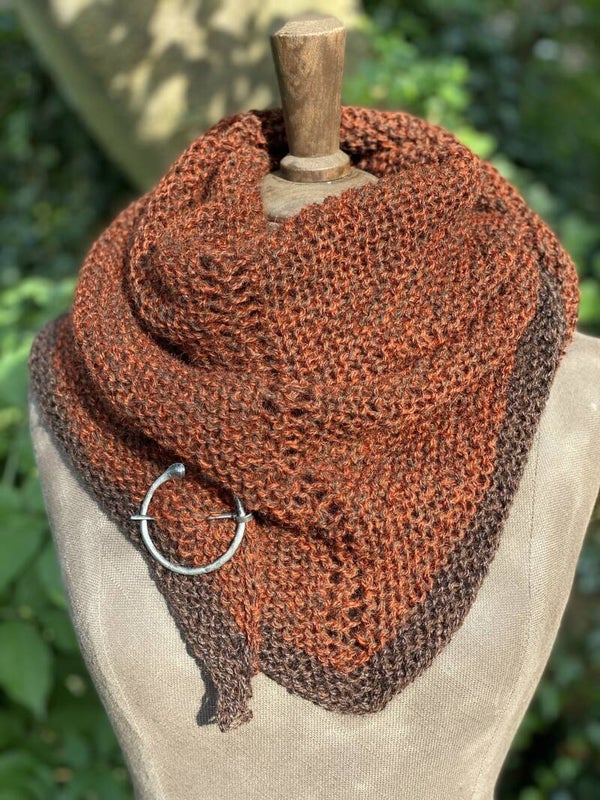 Je kunt hem als omslagdoek gebruiken zoals in de serie, maar ook als sjaal om de hals met de punt naar voren. Hij vormt makkelijk, en heeft extra lange 'vleugels' zodat de knoop blijft zitten.