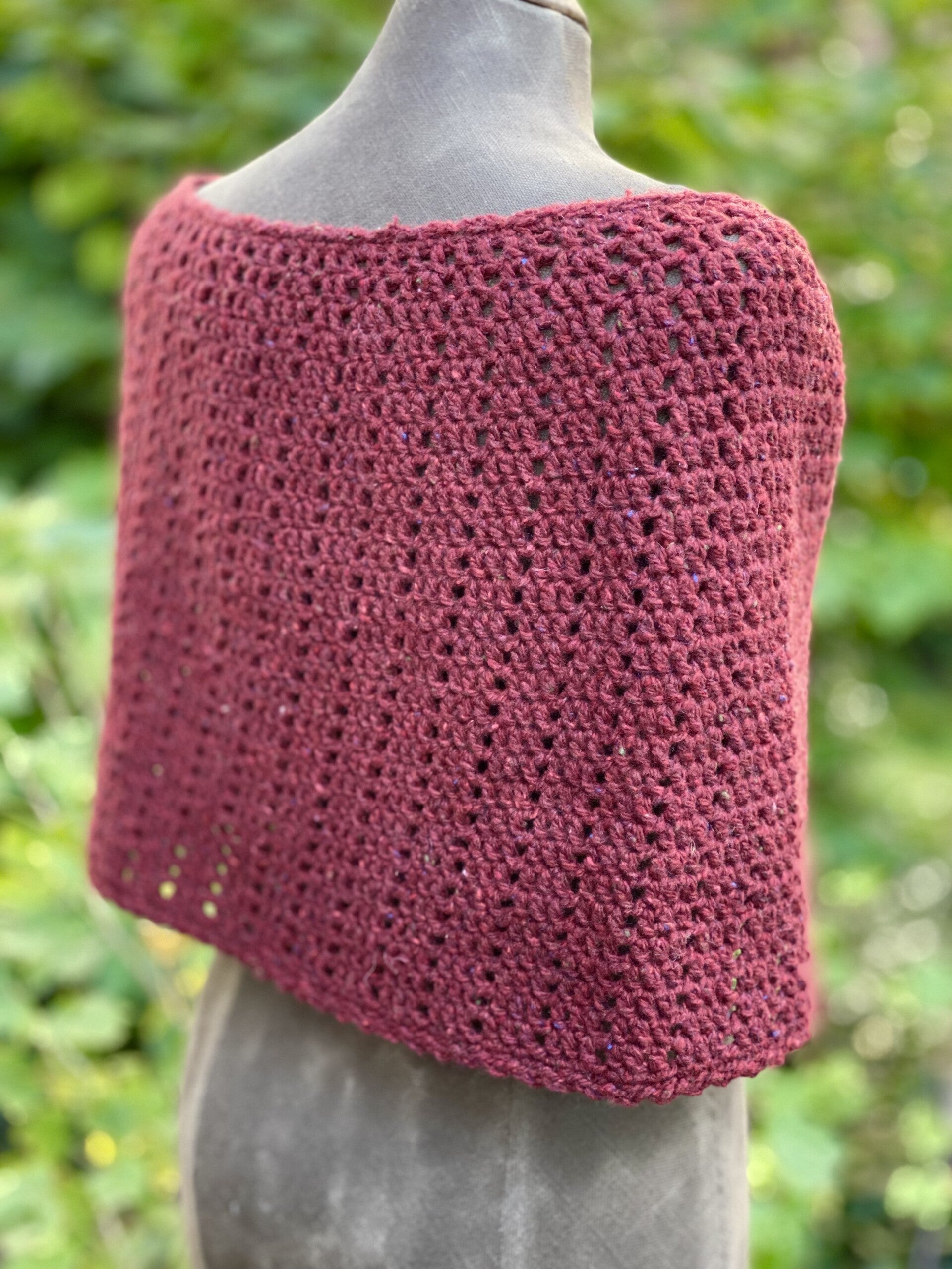 Heerlijk stoere poncho, maar toch elegant. Hij is gehaakt van 'cool wool', wol met viscose en polyamide, dat heel prettig draagt.