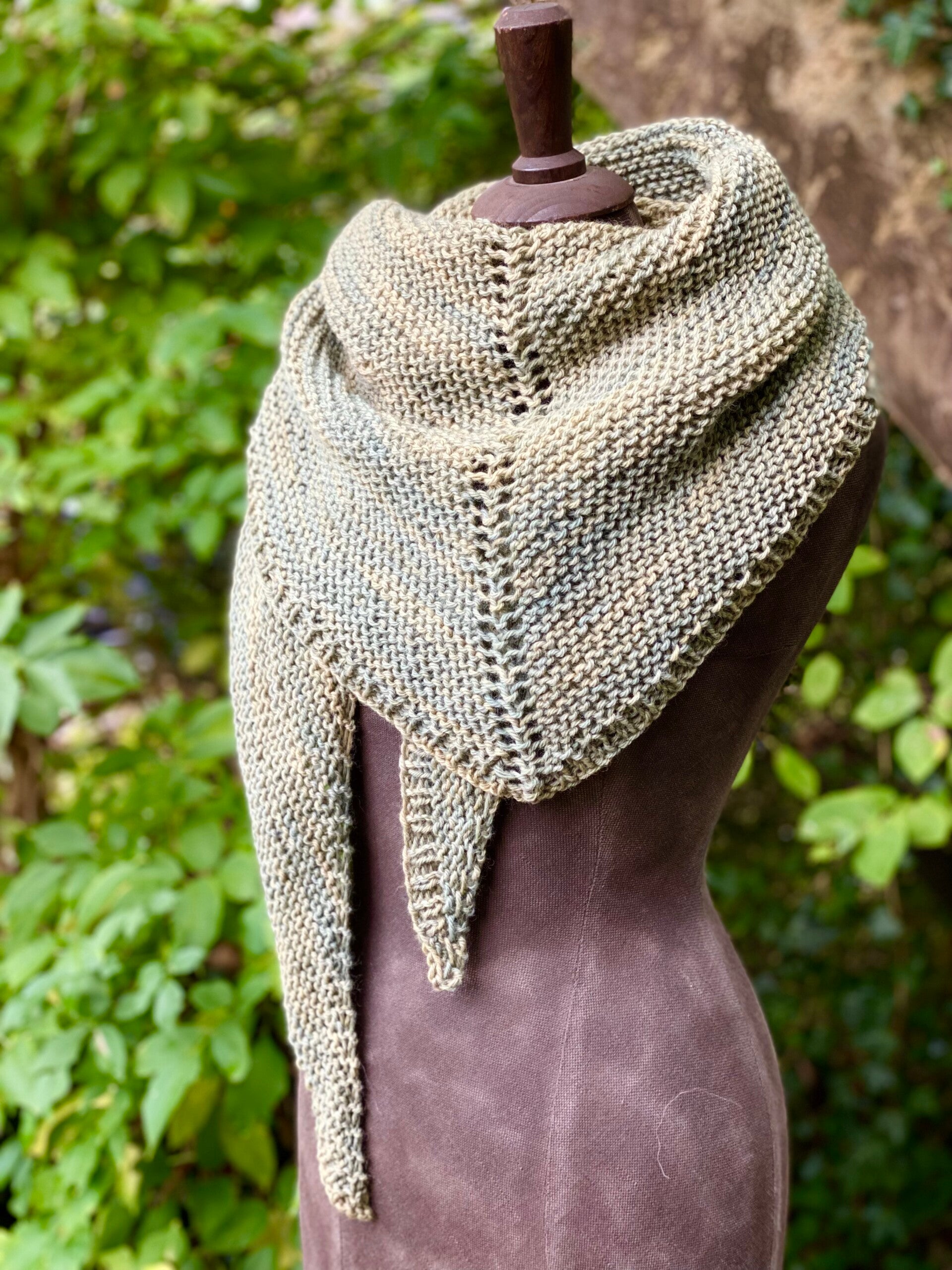 🇬🇧 Our flat traingle shawl is made to be worn like Claire in Outlnders - but the possibilities are endless. This shawl has been knitted with 100% naturally died wool, with oak gall & indigo.