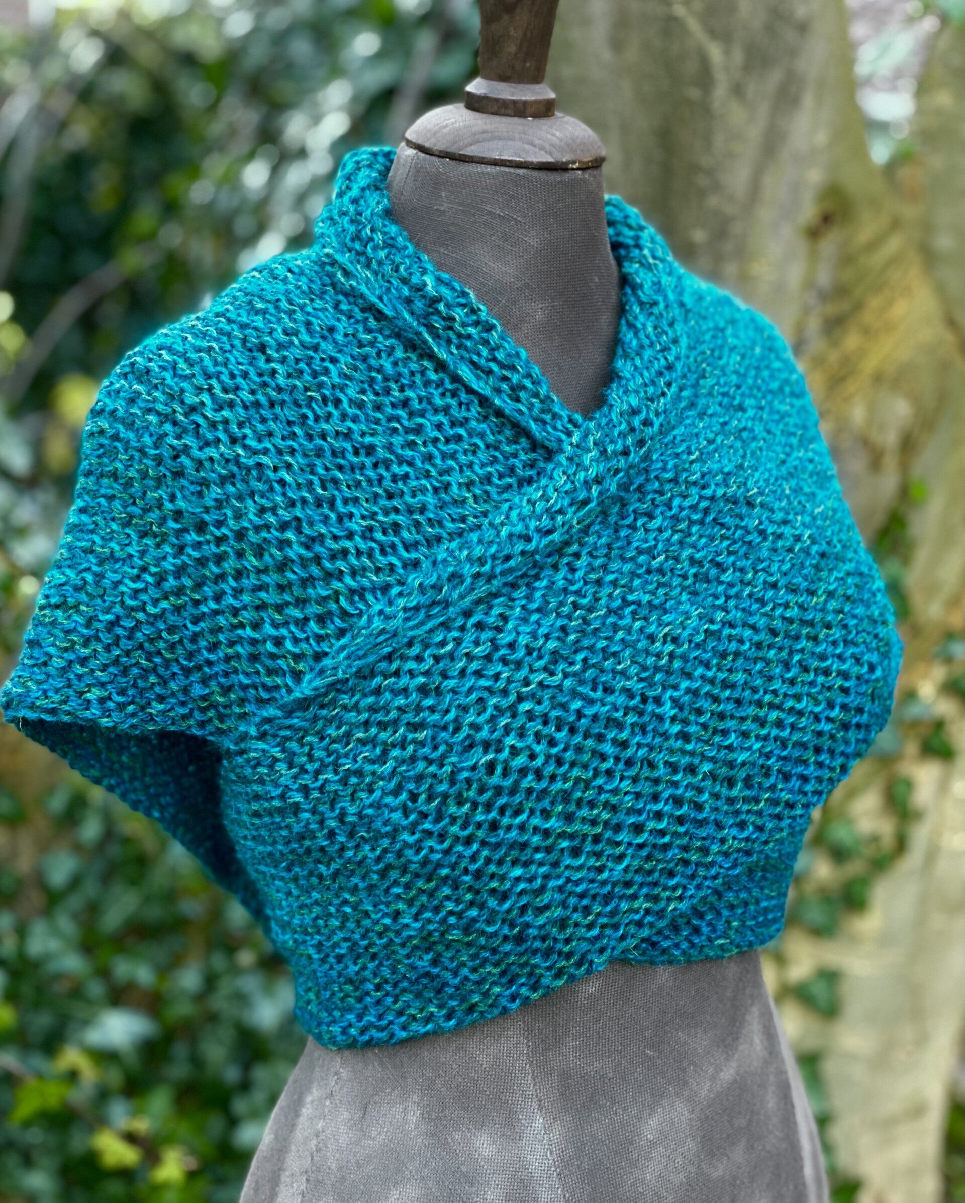 Je kunt hem als omslagdoek gebruiken zoals in de serie, maar ook als sjaal om de hals met de punt naar voren. Hij vormt makkelijk, en heeft extra lange 'vleugels' zodat de knoop blijft zitten.