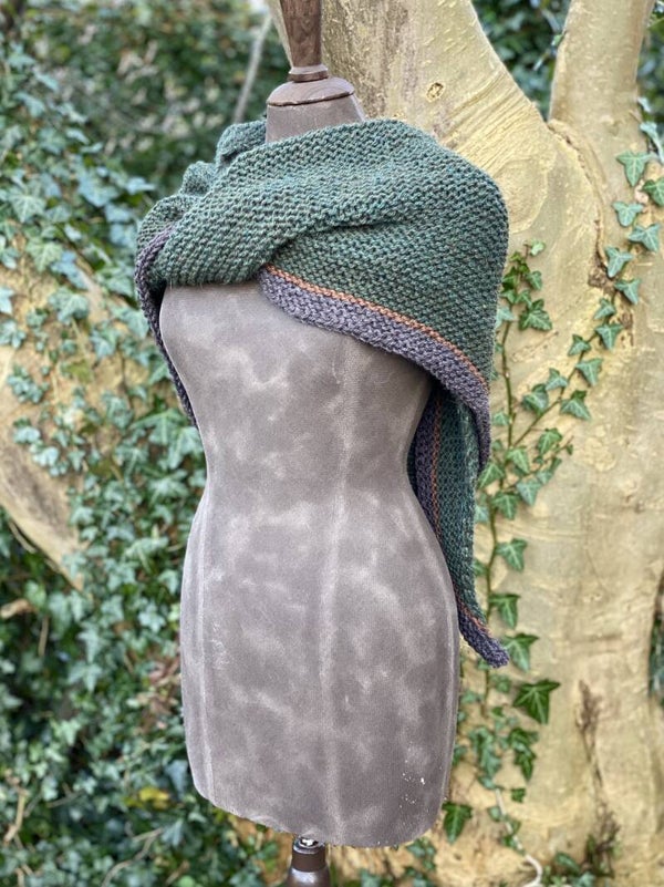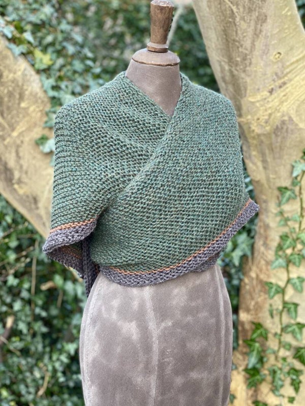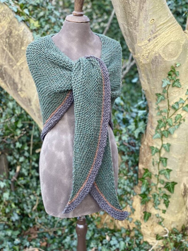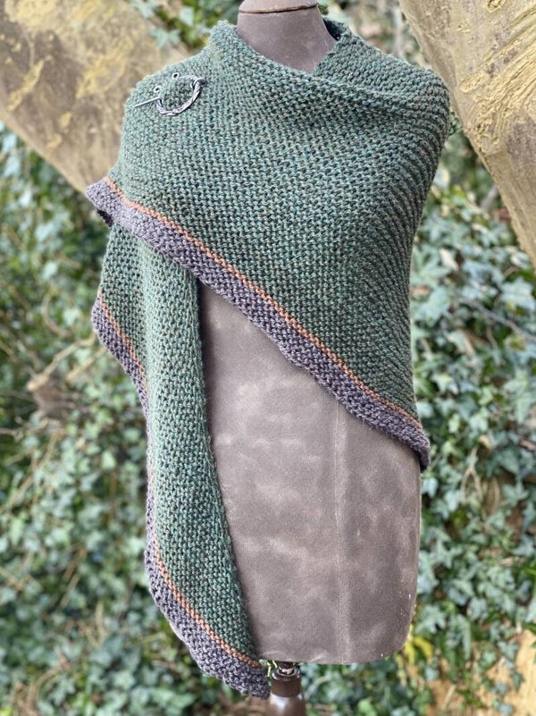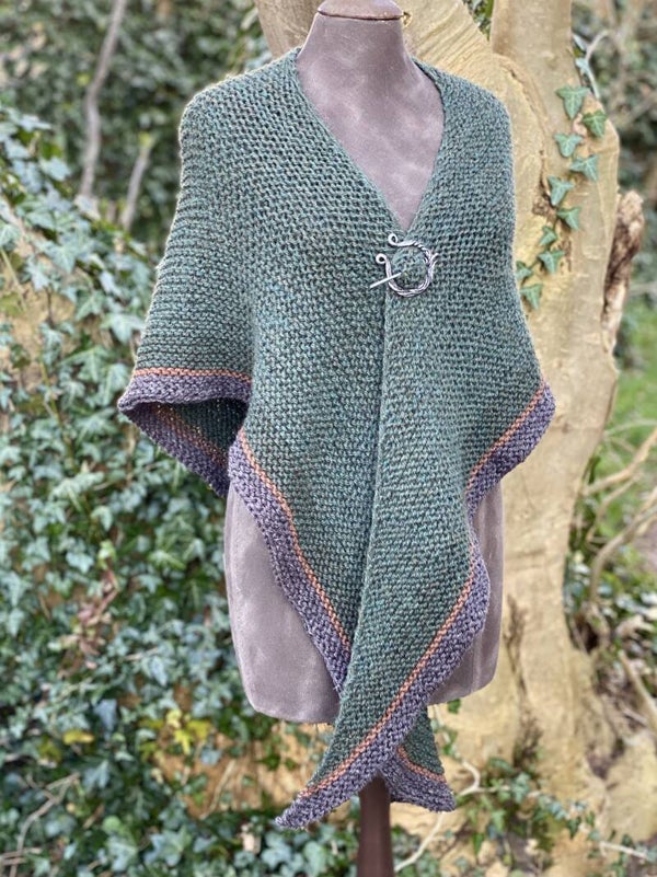 Je kunt hem als omslagdoek gebruiken zoals in de serie, maar ook als sjaal om de hals met de punt naar voren. Hij vormt makkelijk, en heeft extra lange 'vleugels' zodat de knoop blijft zitten.