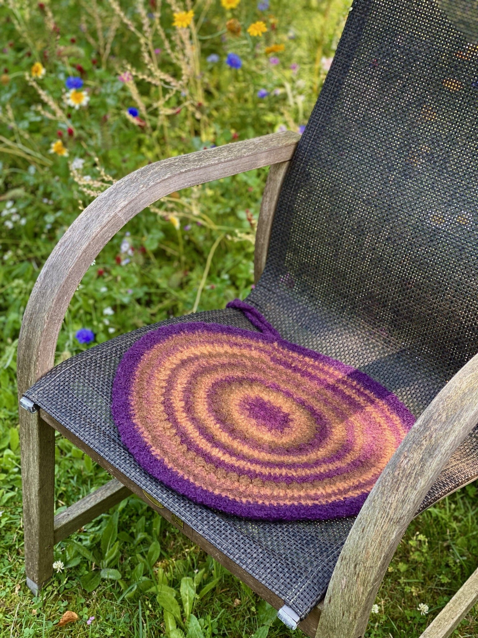 A pretty, but also very practical mat, suitable for just about all outdoor situations: the woolen mat is crocheted and felted afterwards, making it very insulating against cold from the below. It is easy to roll up and to bind it with the straps, making it fit in the side-pocket of a backpack. It is excellent for festivals, hiking, or simply for the bench in your back garden - your outdoor season just gets prolonged.